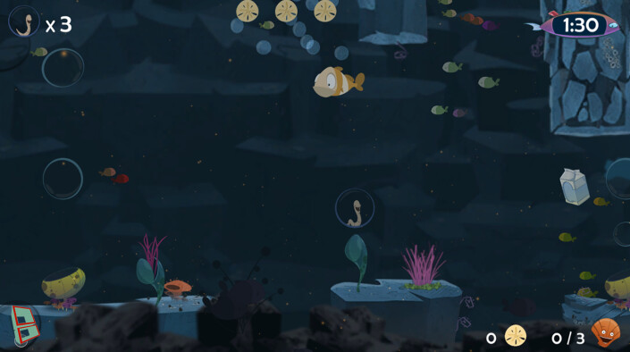 After having escaped from the fisherman’s bait can, you plummet down into the reef. There you must make your way out while traveling in a breathable air bubble. Avoid obstacles and explore each level with care since there are hidden items that are essential to get to freedom.