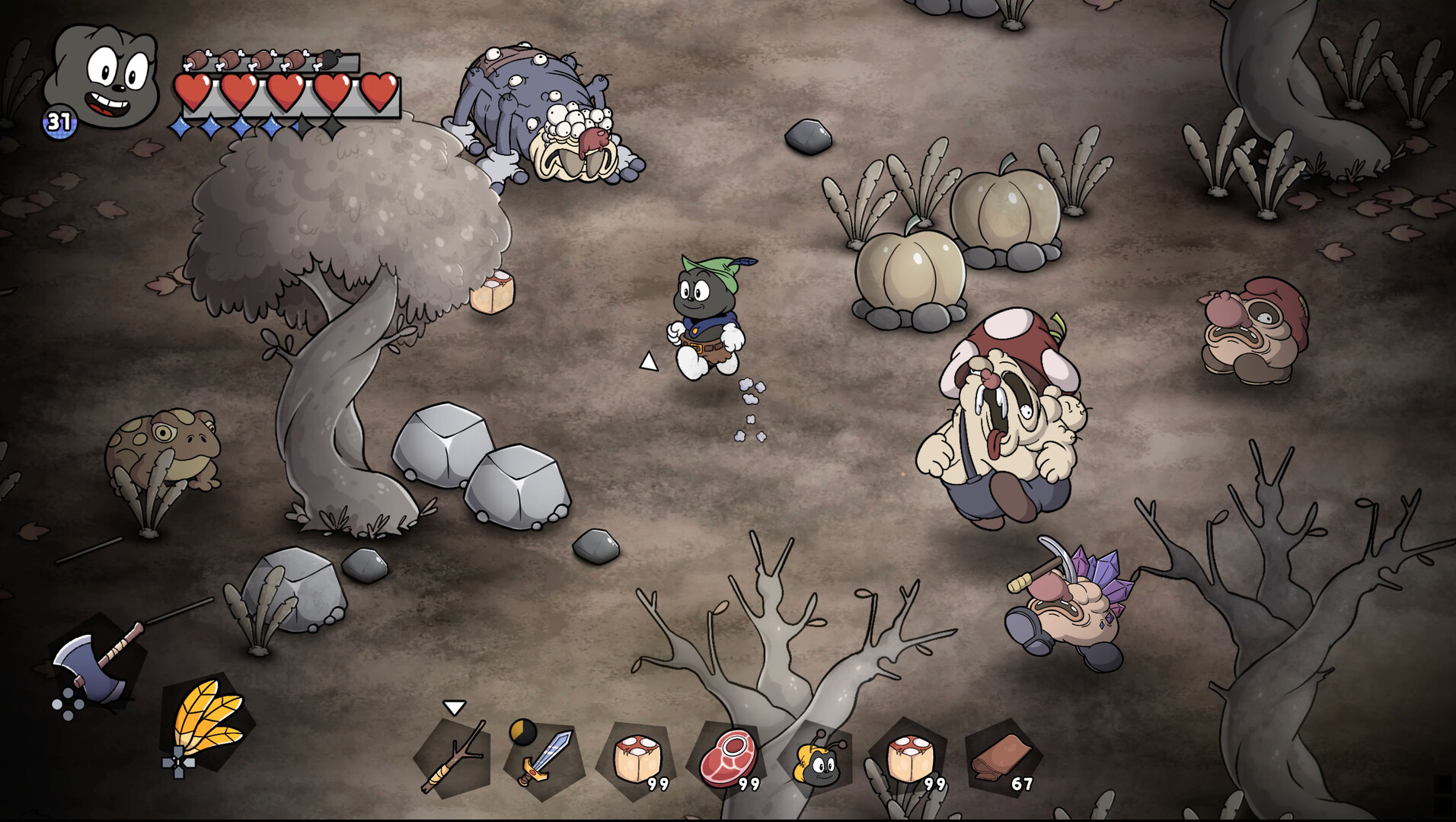 Gombo’s world is alive with detail, brimming with dynamic biomes, hand-crafted dungeons, and a deadly day and night cycle. Embark on a journey to uncover the mysteries of these enchanted lands, take on quirky sidequests and meet a colorful cast of characters eager to lend a hand - or stir up trouble.
