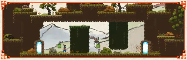 - 고전적인 2D 픽셀 아트와 수제 아시아 잉크 스타일 아트가 혼합되어 있습니다.