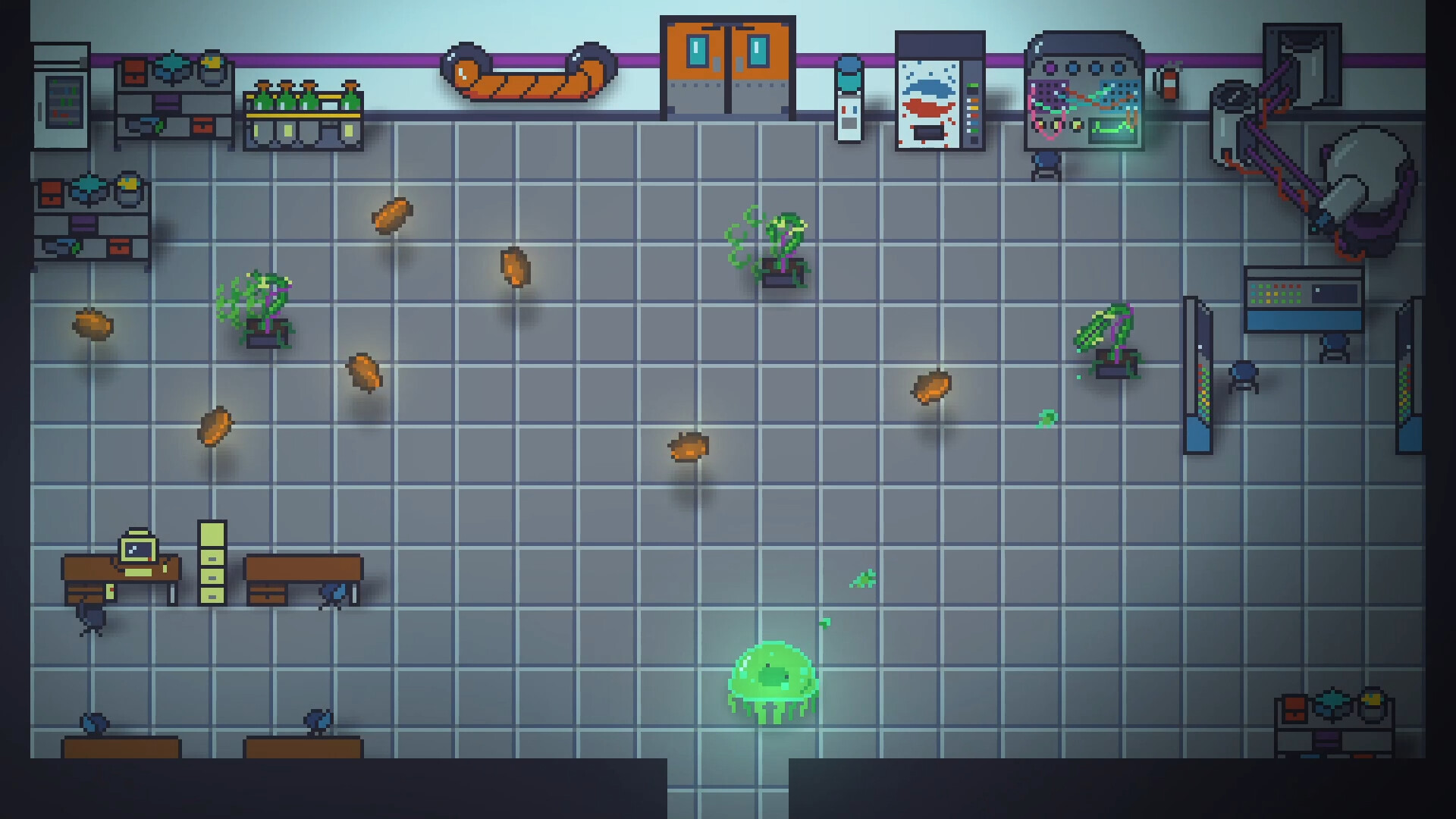 In Caustic Bloom, you play as Ted, a new employee at “Sarcophagus II”, an underground laboratory, dedicated to all sorts of interesting studies. One afternoon, things take a turn for the worse when a gas fills the lab, causing everything it touches to grow and become violent. You’re able to escape to a biohazard quarantine chamber, but the windows of the chamber were not built to hold against what’s waiting on the outside. A struggle ensues, a transfiguration takes place, and Ted’s world will never be the same.