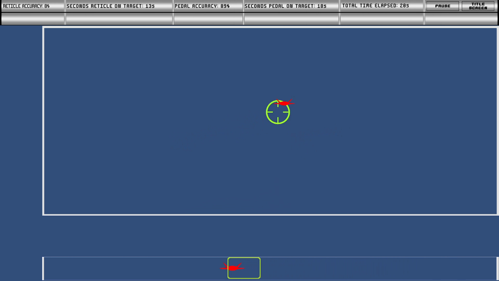 [TBAS] PEDAL TRACKING TEST (Rudder Pedals Recommended): An aircraft silhouette travels horizontally from left to right on the bottom of the screen. Rudder pedals, arrow keyboard keys, or gamepad shoulder buttons are used to move a box over the aircraft silhouette. The goal is to raise your "Pedal Accuracy", which increases when the pedal box is over the aircraft silhouette.