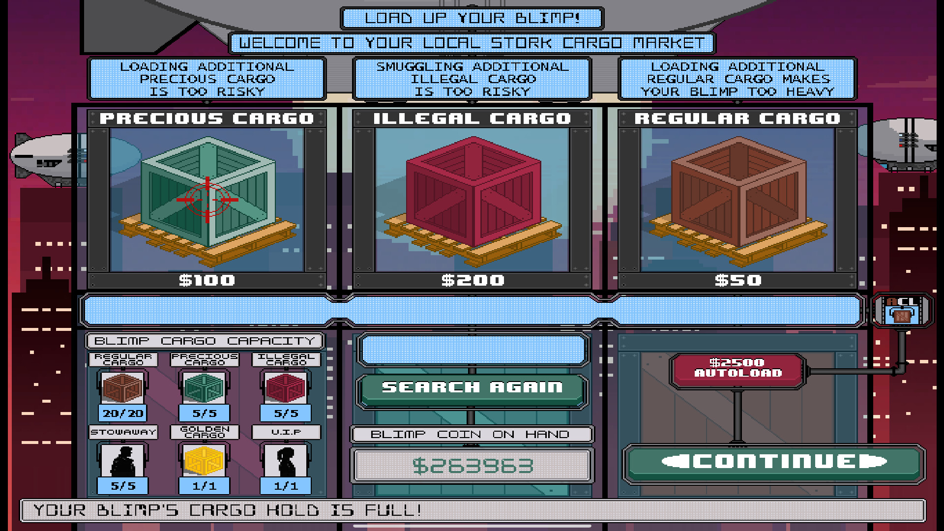 2. Load your Blimp with Cargo: You can load it with regular, precious, illegal, and stowaway cargo and deliver it to trading stork ports worldwide.