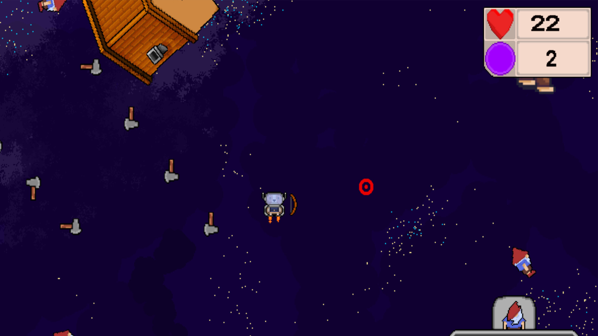 Adorable dog: Gnomeageddon is a 2D Pixel art, top down action game. You must Defend your village from waves of Gnome attackers. Between attacks you may try and rescue your friends from the Gnomes, who are scattered across time and space. These friends will aid you in the defence of your village.Collect the very elixir's that caused this catastrophe in the first place to enhance your bow with devastating new effects or heal your self.