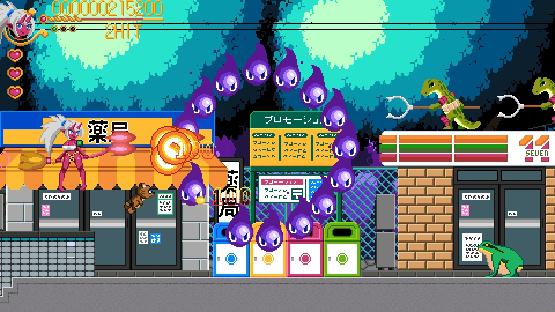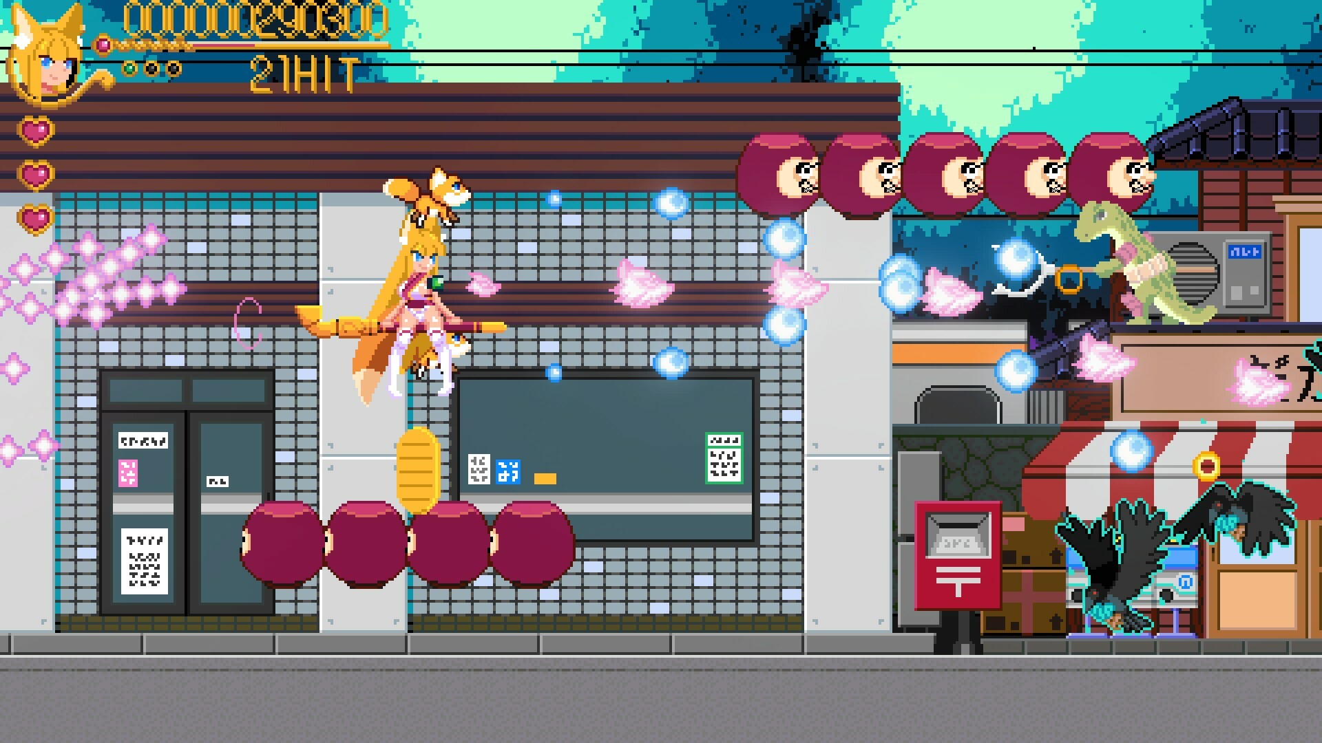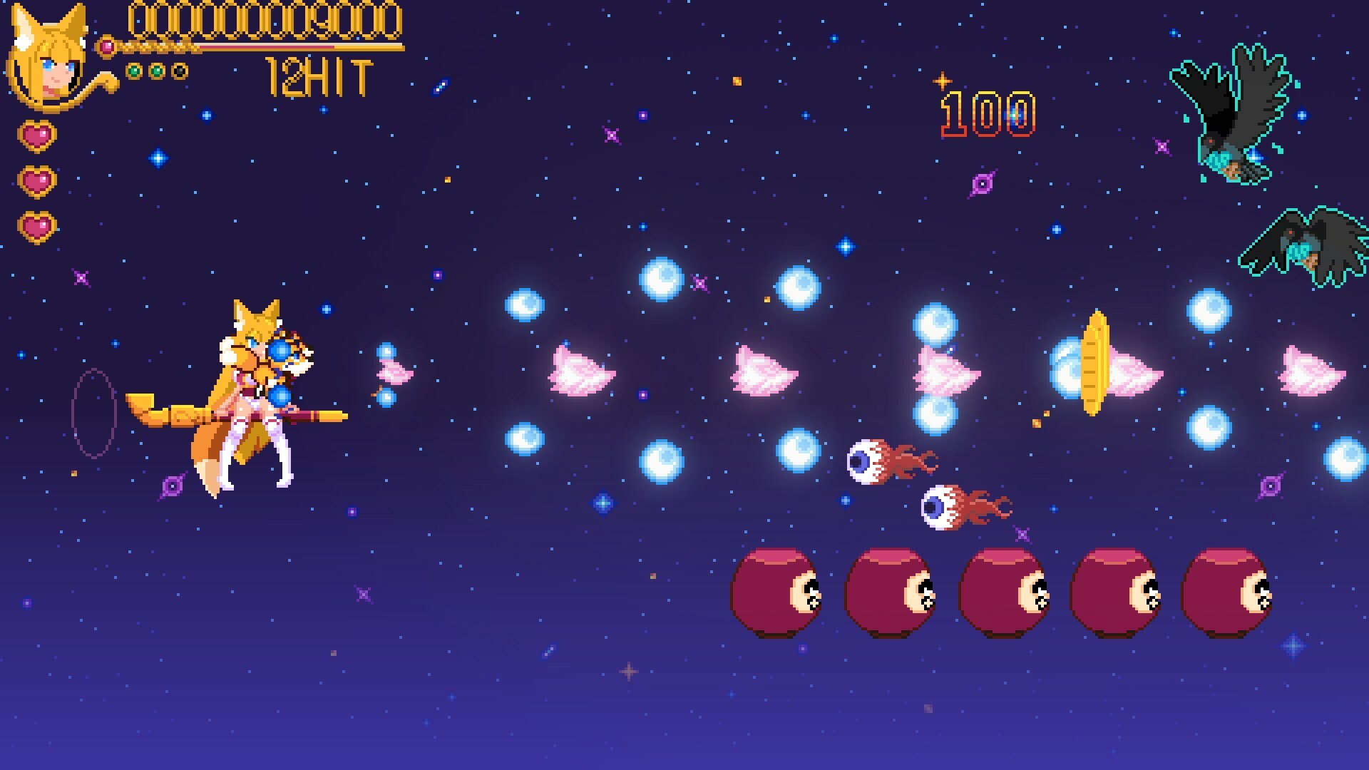 픽셀 아트 스타일의 플레이 가능한 캐릭터로 4명의 아름다운 요괴 소녀, 각각 다른 유형의 조수와 해변복 버전!