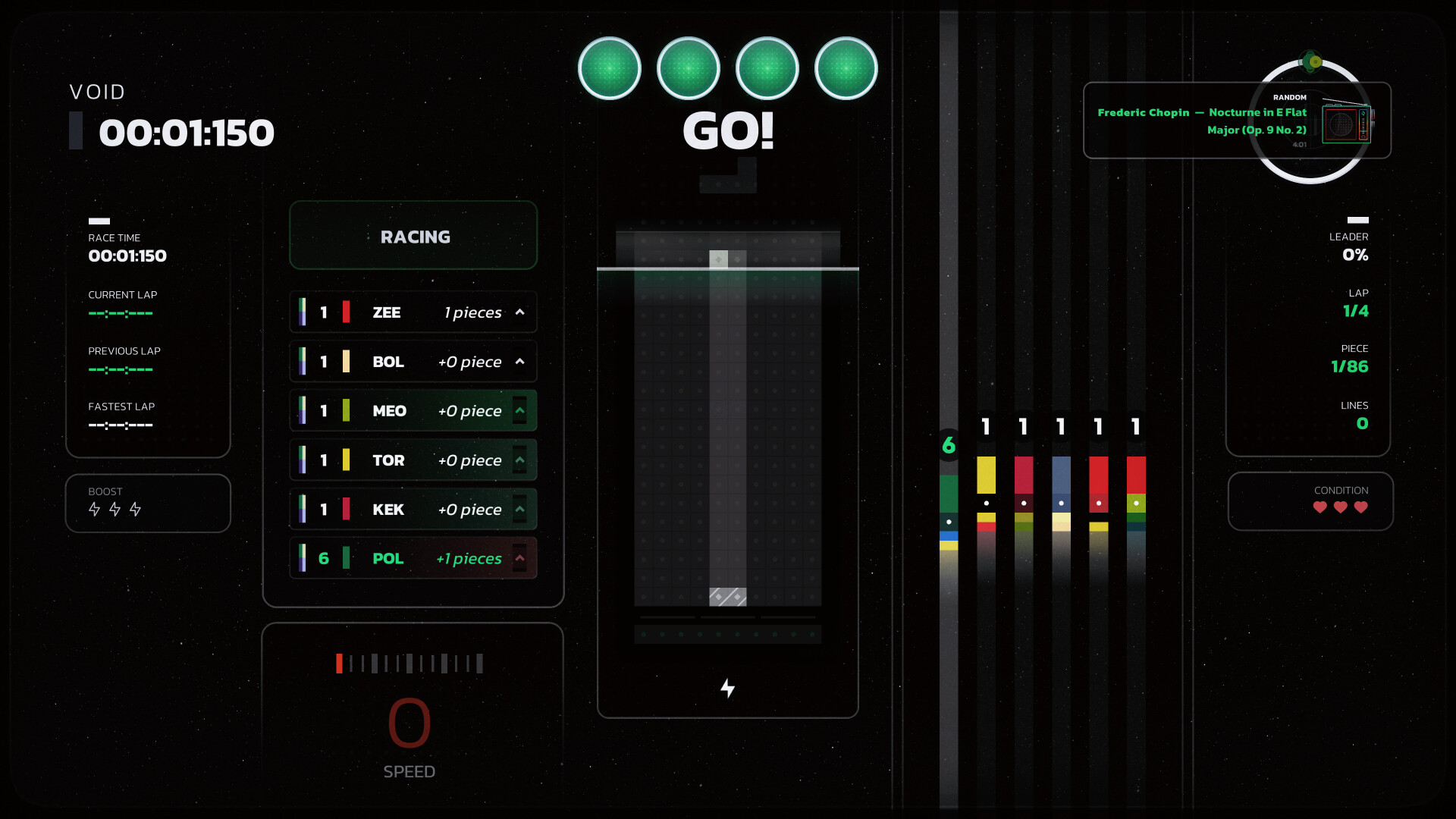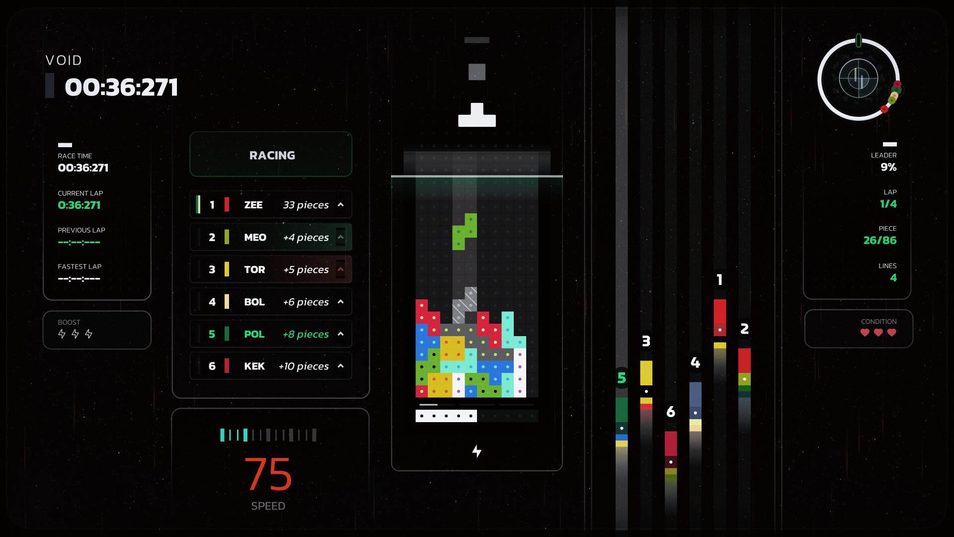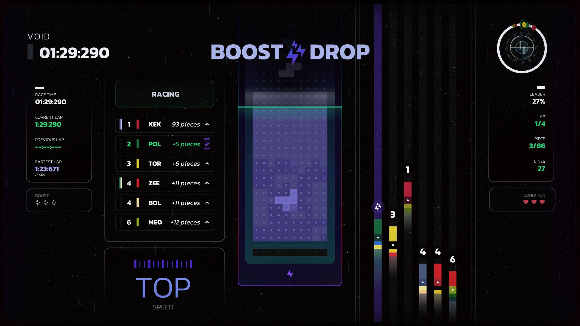 Drop Racing is a block-based game with a racing mindset: the winner is whoever lands all the pieces on the track first.