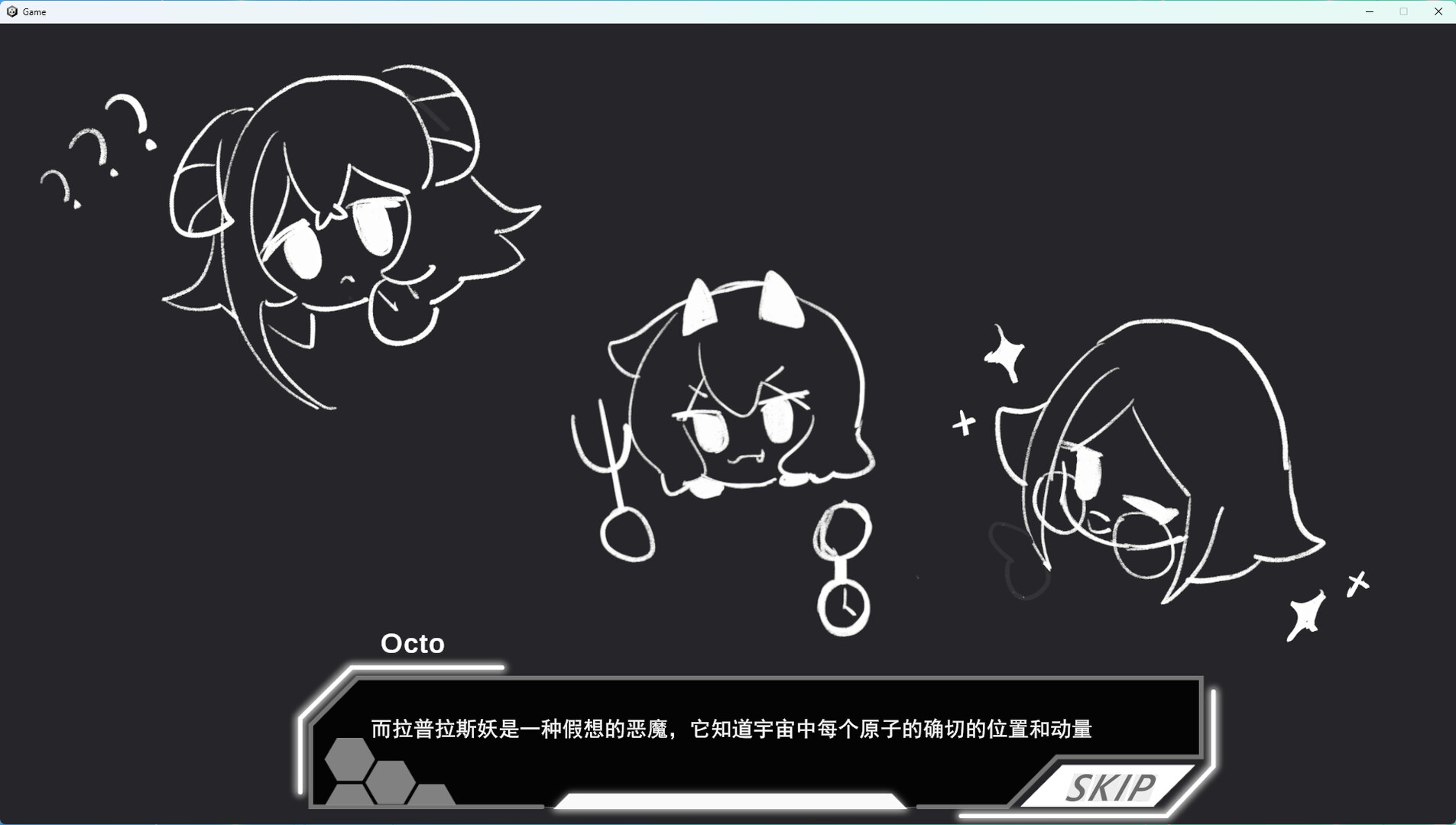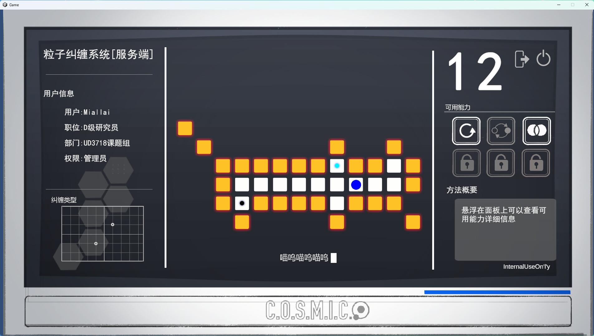 The player hacks the device to obtain clues in the form of puzzles. The puzzles allow the player to control two entangled particles with different spin directions, which will move in different directions. The player needs to make full use of the mechanism to get them to the specified location. Solved puzzles can light up stars on the panel to advance the plot.