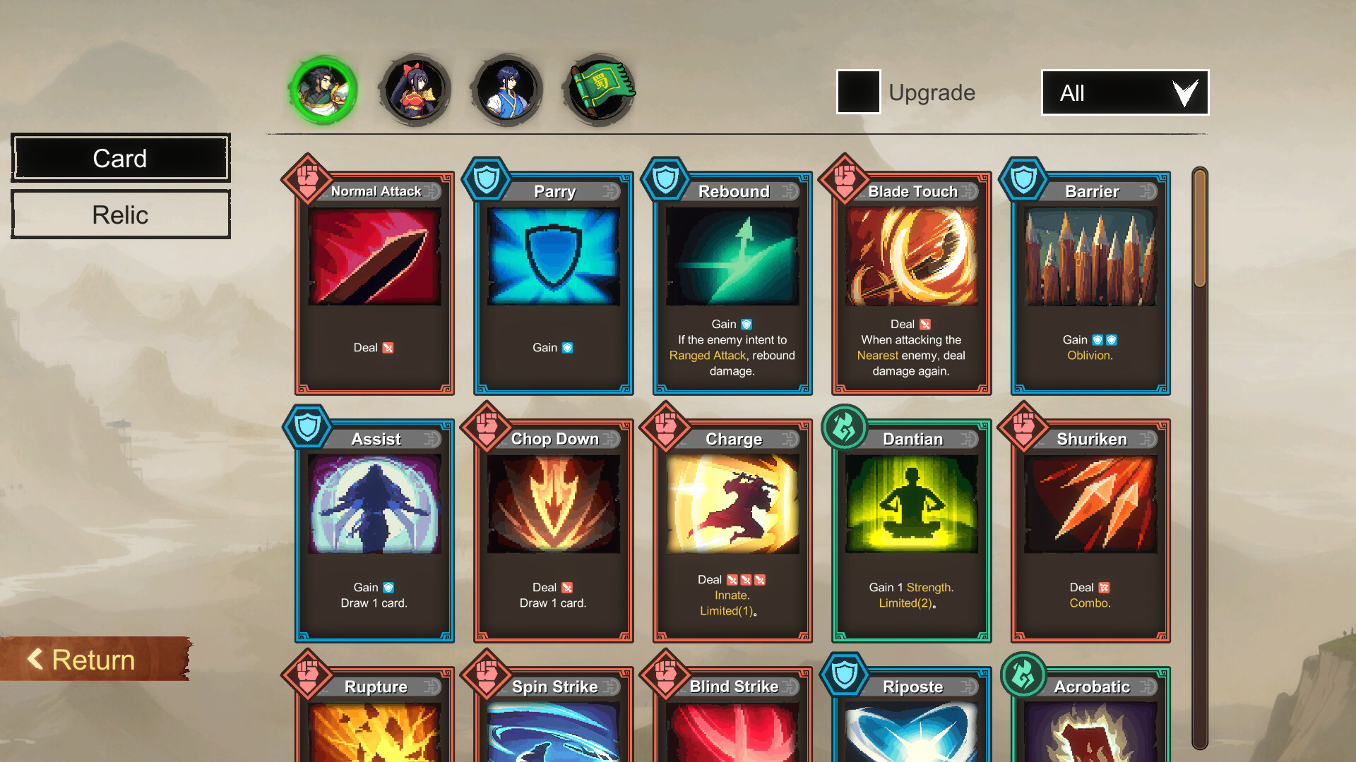 자유로운 카드 시스템: 카드에는 비용 개념이 없으며, 공격 / 방어 / 기술 / 보조 네 가지 유형으로 나뉘어 있습니다. 각 카드의 사용 타이밍과 조합이 승리를 결정짓습니다.