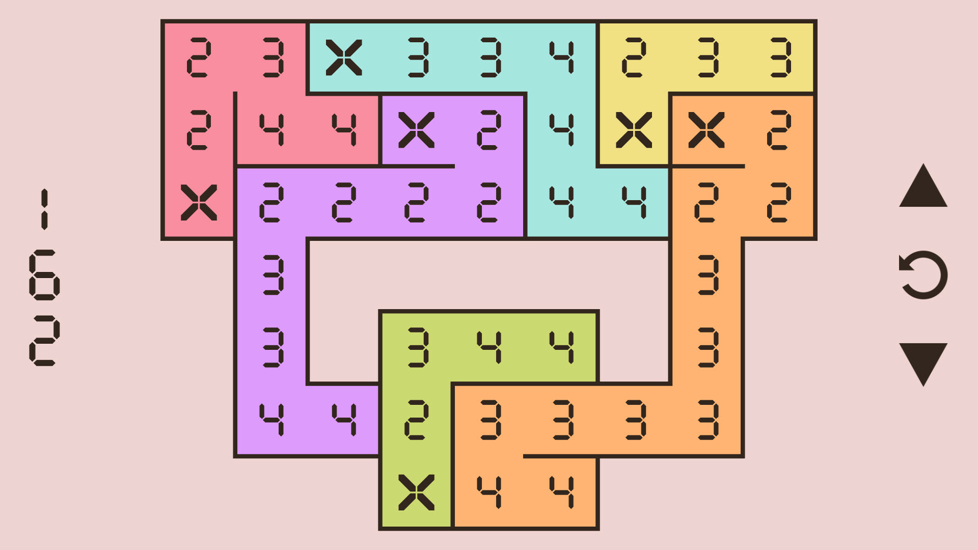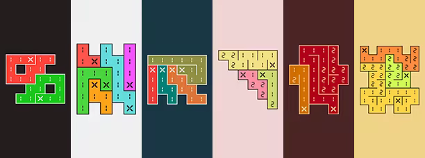 Each puzzle begins with a monochrome grid of numbers, plus a few colored cells marked with an X. Starting at these cells, you must link up numbers in non-decreasing order until the whole grid is filled with color. The demo version contains the first 100 puzzles.