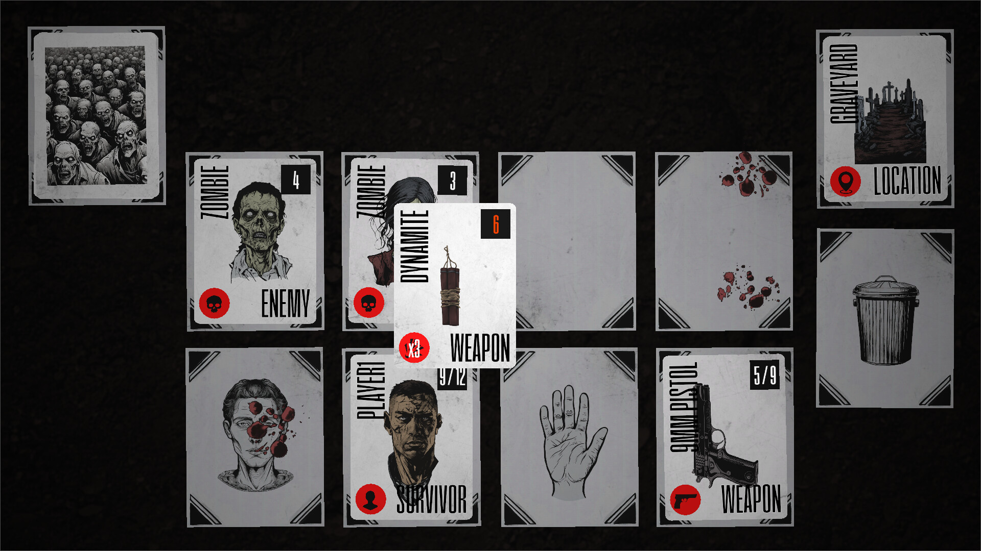 Fight your way through a zombie-infested city in search of rescue. Wield a variety of single-use melee weapons and reloadable ranged weapons to take down the undead. Increase your chances of survival by rescuing other survivors and searching for first aid kits and other usable items along the way. Each deck is randomized and reshuffled as you progress through different locations to ensure a unique play though every time.
