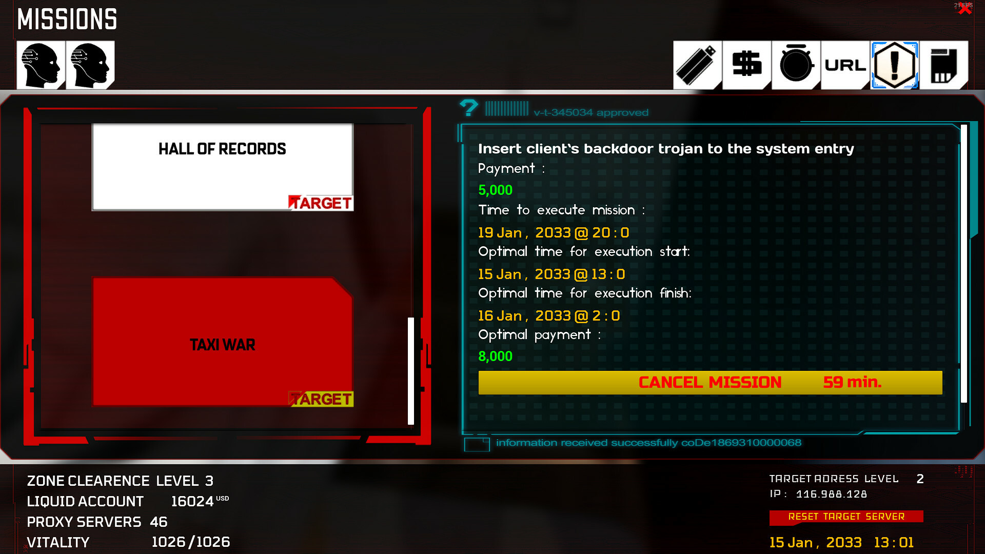 Starting new in the business, take easy jobs and finish them to get better paid yet more challenging contracts. Spend the money to upgrade your cyberdecks software, or save it