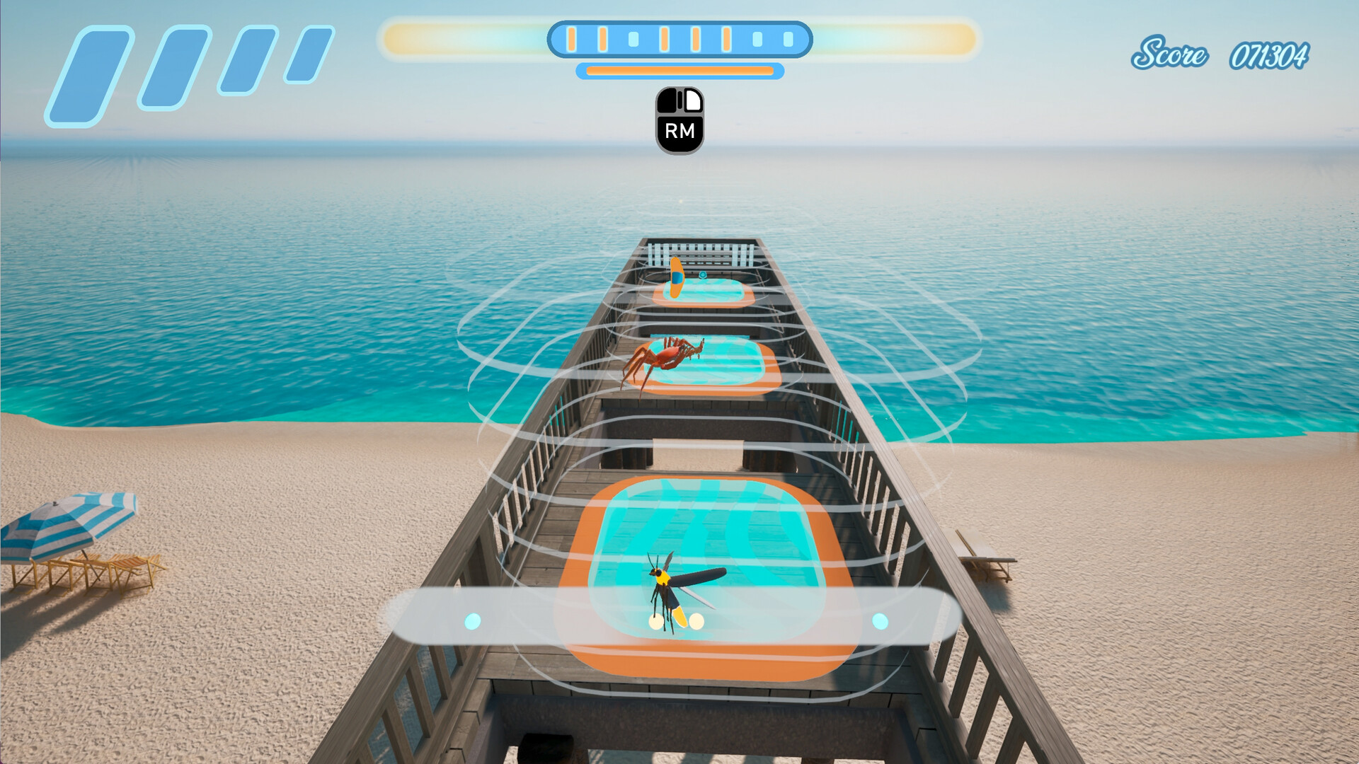 You are reincarnated as a crab in this fast-paced rhythm platformer. Gain speed by hitting notes on beat with full 3D control. Time your jumps and boosts to the music as you race across dancing shorelines while dodging hostile urchins and seagulls.