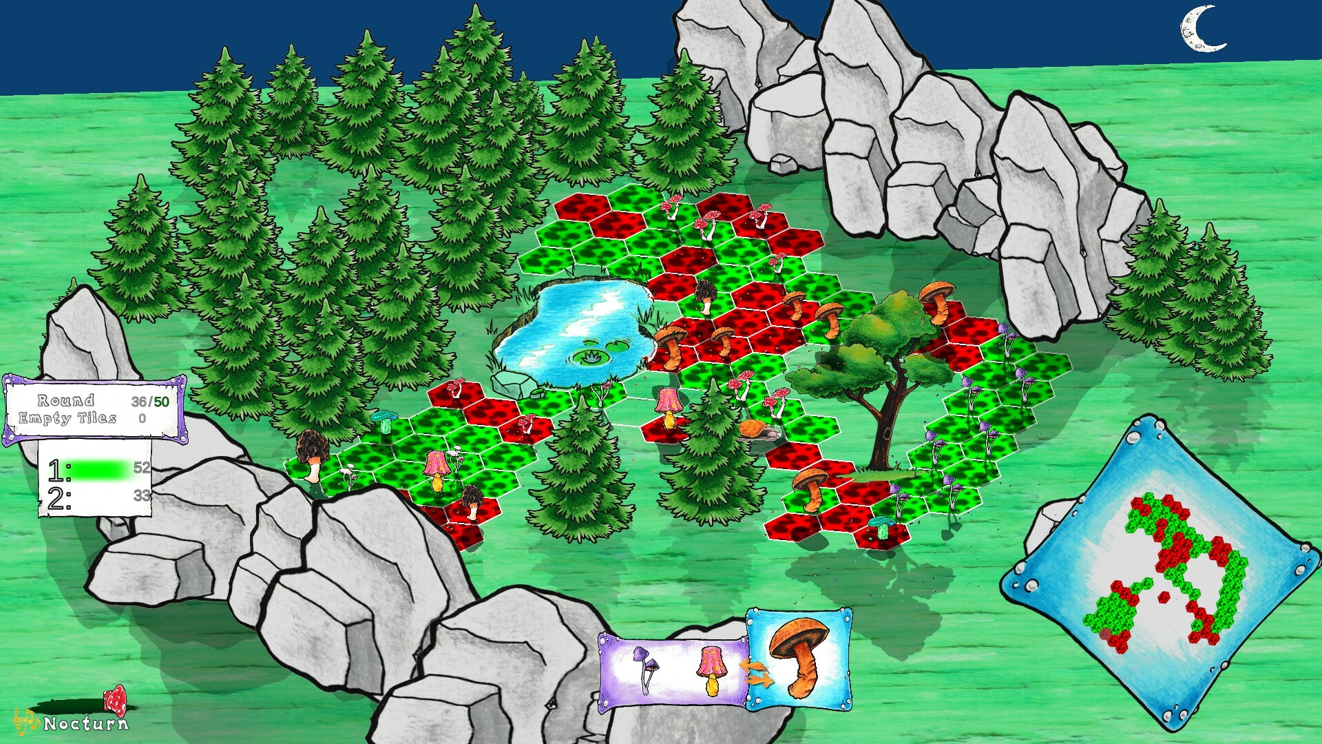 Innovative Gameplay: Immerse yourself in a unique and strategic gameplay loop. Carefully place a variety of mushrooms across a hexagonal field and initiate chain reactions to spread your spores, dominating the playing space.