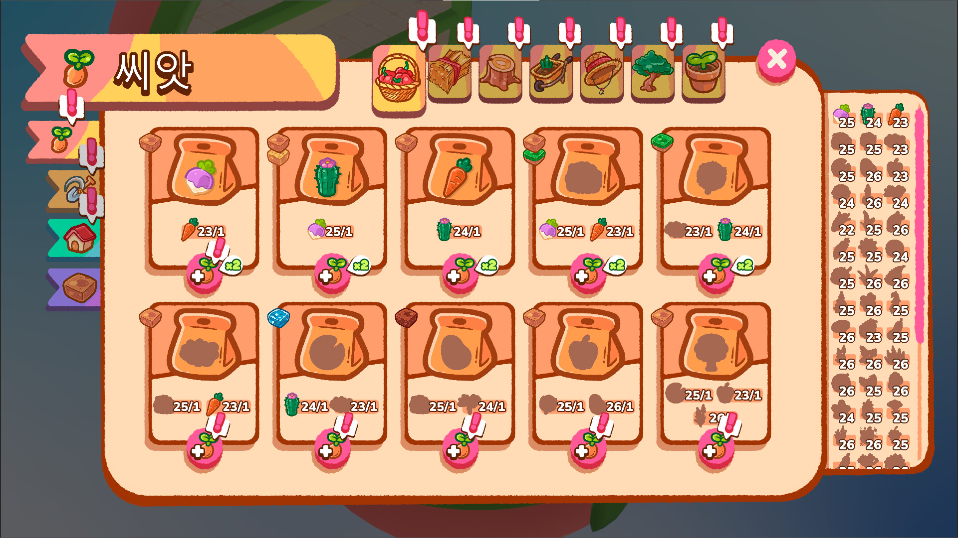 편지,꾸미기요소 신경안쓰고 농작물 전체해금은 4시간정도 걸리네요. 레버를 돌리면 한턴 넘어가지만, 말이 턴이지 시간제한/턴수제한 같은것이 없으니까 막 돌려도 되서 너무 편해요. Q/E로 화면을 돌릴 수 있습니다 ~ 분수나 나무에 농작물이 가려서 수확하기 어려울때 화면을 돌려보세요. 폴리포켓 스타일 귀여운게임이에요 ㅋ_ㅋ 더 귀여운 스티커가 많이 나왔으면 좋겠어요. 게임하다보면 농작물을 어느땅에도 심지 못하게 되는 상황이 생길때도 있고, 필요한 농작물을 전혀 어디서 얻는지 모르는 상황이 있을 수도 있습니다. 이건 의도된 것입니다. 저도 첨에 버그나 미개발인줄 알았어요ㅋㅋㅋ 농작물 설명을 잘 읽어보시면 알 수 있어요. 도저히 진도가 안나가고 막힌분들만 보세요. [spoiler] *해바라기는 심으면 초록땅이 도중에 없어져서 자꾸 시들어버리는데, 수국이나 라즈베리를 □ 부분에 심으면 ✿부분도 초록땅이 됩니다. 여기에 해바라기를 심고 수국/라즈베리를 수확하지 않으면 계속 해바라기밭으로 만들 수 있어요. □✿□ □✿□ □✿□ 이런식으로요 *쌀도 이런식으로 논을 만들어야합니다. 분수를 ◆부분에 놓으면 논▣ 이 생깁니다. ▧▧▣▧▧ ◆▧▣▧◆ ▧▧▣▧▧ *감자는 물옆에 선인장을 심으면 짙은 갈색땅이 되는데 여기에 심을 수 있습니다. *잔디 아래칸에 있는 식물은 담쟁이덩굴인데 나무 위에만 심어집니다. 느릅나무를 심고 느릅나무가 다 자라면 그 위에 심어보세요. 어떤종류의 땅에 심는건지 아무표시가 안되어있는 식물은 거의 나무 위에만 심어집니다. * 담쟁이 덩굴 오른쪽에 있는 버섯은 나무 그늘에 심을 수 있습니다. 버섯 종류는 다 나무그늘에 심어져요. * 포도는 처음에 청포도가 열리는데 또 돌리면 색깔이 점점 보라색이 되다가 마지막엔 주변에 뱅글뱅글 이펙트가 생기면서 발효된 포도가 됩니다. 두개가 다른 아이템 취급이니 주의하세용 [/spoiler]