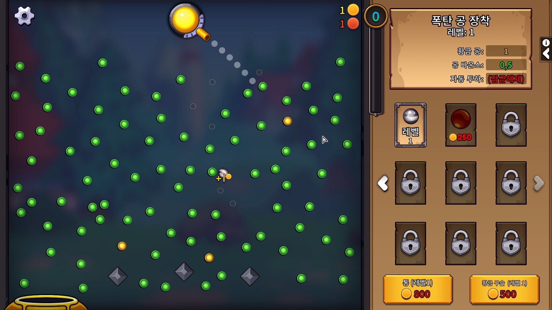 페그 부수기 (매일 업데이트되지는 않으며, 작성자가 원할 때마다 업데이트됩니다.) [1일차] 보드에 페그들이 존재하며 공을 쏘아서 이를 제거할 수 있습니다. 초록색은 별다른 보상이 없고 황금색은 골드, 주황색은 프레스티지 점수를 올려주죠. 보드 하단에는 홀이 좌우로 움직이고 있으며 공이 이 안으로 들어가면 공의 가치만큼 골드를 획득합니다. 보드의 모든 페그들을 제거하면 다음 보드로 교체되면서 반복되는 구조이죠. 획득하는 골드는 새로운 공을 구매하거나 공을 업그레이드하는대에 사용됩니다. 공의 가치를 올릴 수도 있고 자동 투하 간격 단축, 최대 공 수량 등을 올릴 수 있죠. 공은 홀이나 하단에 추락하여야 충전되어 다시 쏠 수 있기에 공의 수량이 적으면 은근 답답할 수도 있습니다. 다른 공을 구매할 경우, 숫자키를 눌러서 변경하여 사용할 수 있어서 좀 귀찮은.... 외에도 하단의 통이나 황금 구슬의 배수를 증가시키는 업그레이드도 가능합니다. 프레스티지는 특정 포인트 이상등의 제한없이 이용가능합니다. 보유한 포인트로 특성을 활성화할 수 있고 연결된 다른 특성들을 활성화 가능하죠. 이를 통해 특별한 공의 확률이나 효율을 증가시킬 수 있고, 더 많은 페그가 있는 레벨에 도전할 수도 있습니다. 프레스티이 외의 것들은 모두 초기화가 되기에 매번 처음부터해야해서 좀 지루하기도... 외에도 업적과 도전과제들이 존재하며, 도전과제를 완료하면 추가적인 버프들을 받을 수 있습니다. [아쉬운 점] -공 변경을 탭이나 마우스 휠 등으로 가능했으면 좋을듯 -프레스티지마다 공쏘기 귀찮