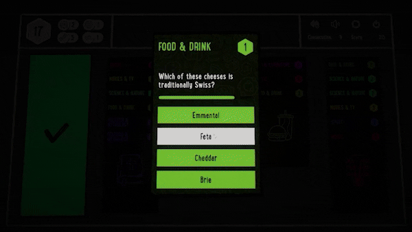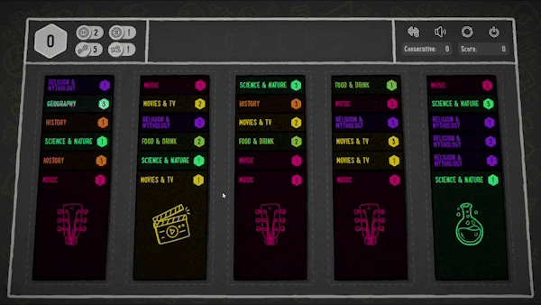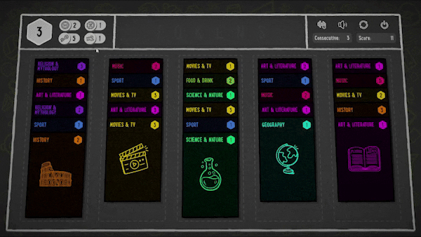 A challenging trivia card game with a randomly dealt deck each run. Test your knowledge by answering multiple choice questions of varying difficulty, earn tokens and use abilities to maximise your chances of conquering the board.