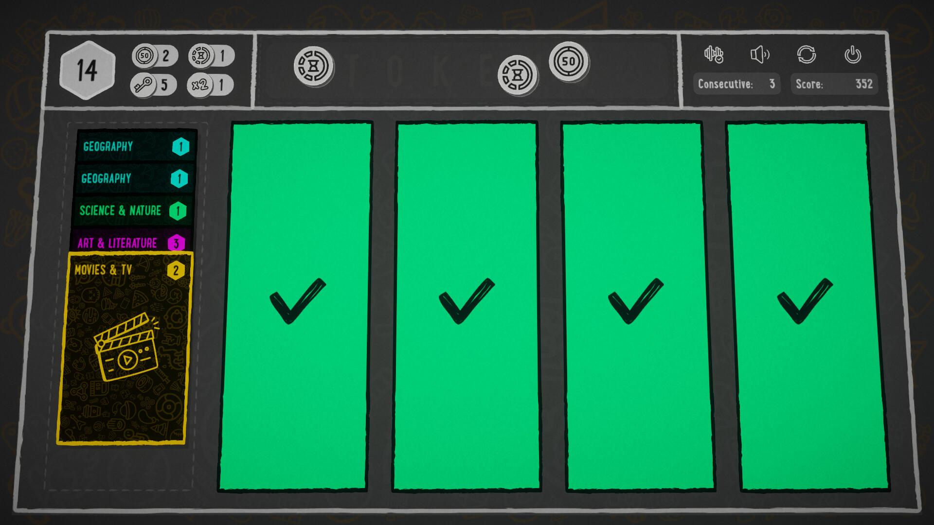 Answering incorrectly will penalise you by locking that column, forcing you to spend 5 tokens to unlock with the key ability.