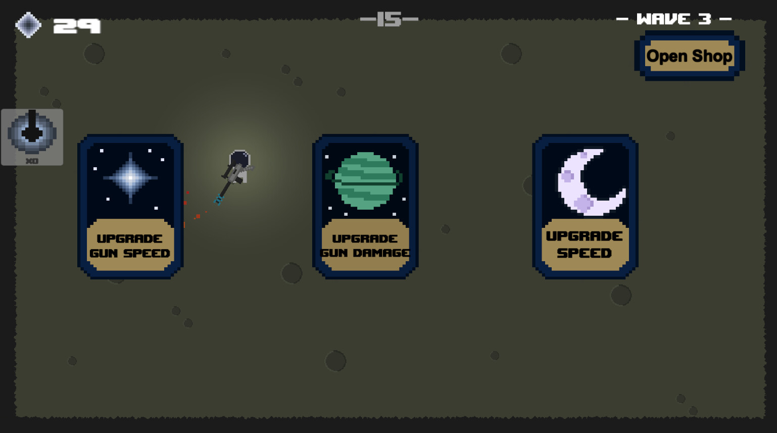 In Lunar Loot you'll kill aliens to make money. In between waves of enemies, you'll spend that money to buy upgrades and items to make it easier to kill aliens and make money. You can't die, so just focus on getting rich!