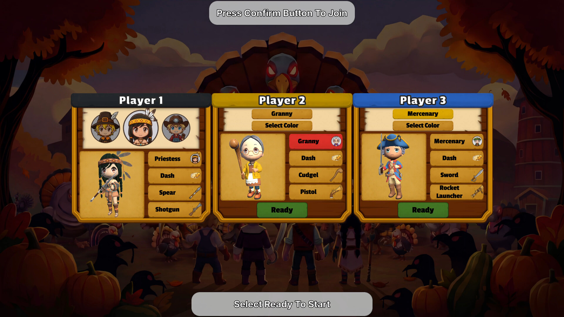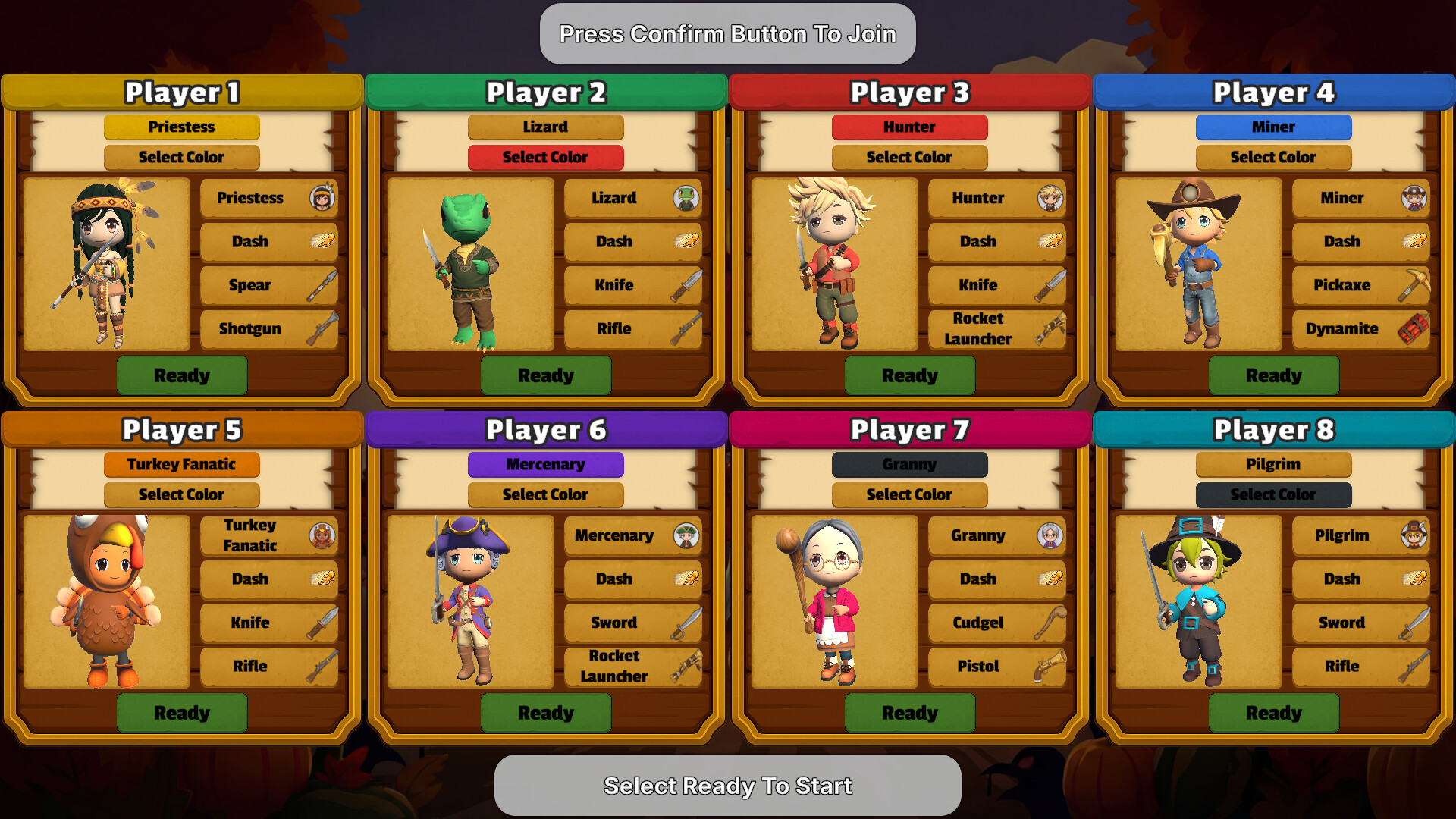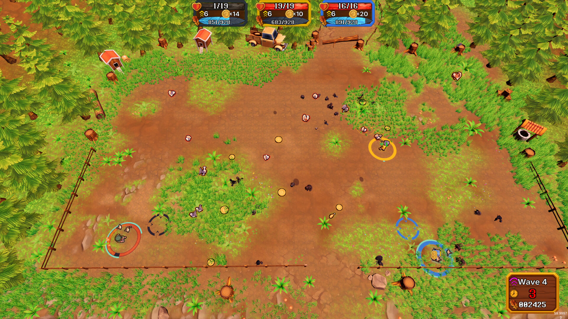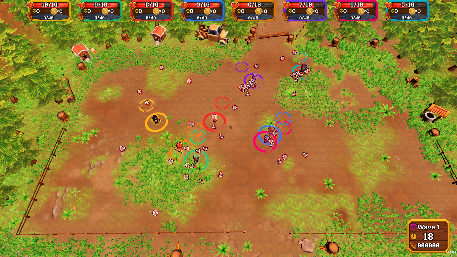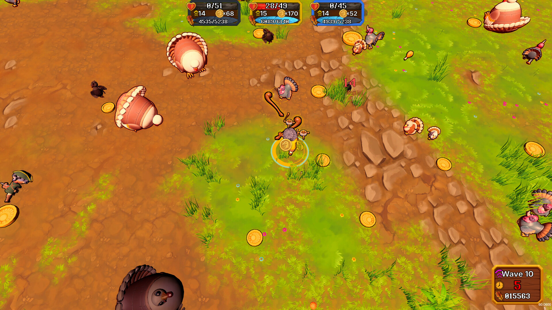 Grab some friends (or go solo) and jump into a chaotic bullet-heaven, couch co-op, wave survival, twin-stick shooter for 1–8 players. Blast through swarms of strange turkeys, fight crazy bosses, scoop up coins and items.