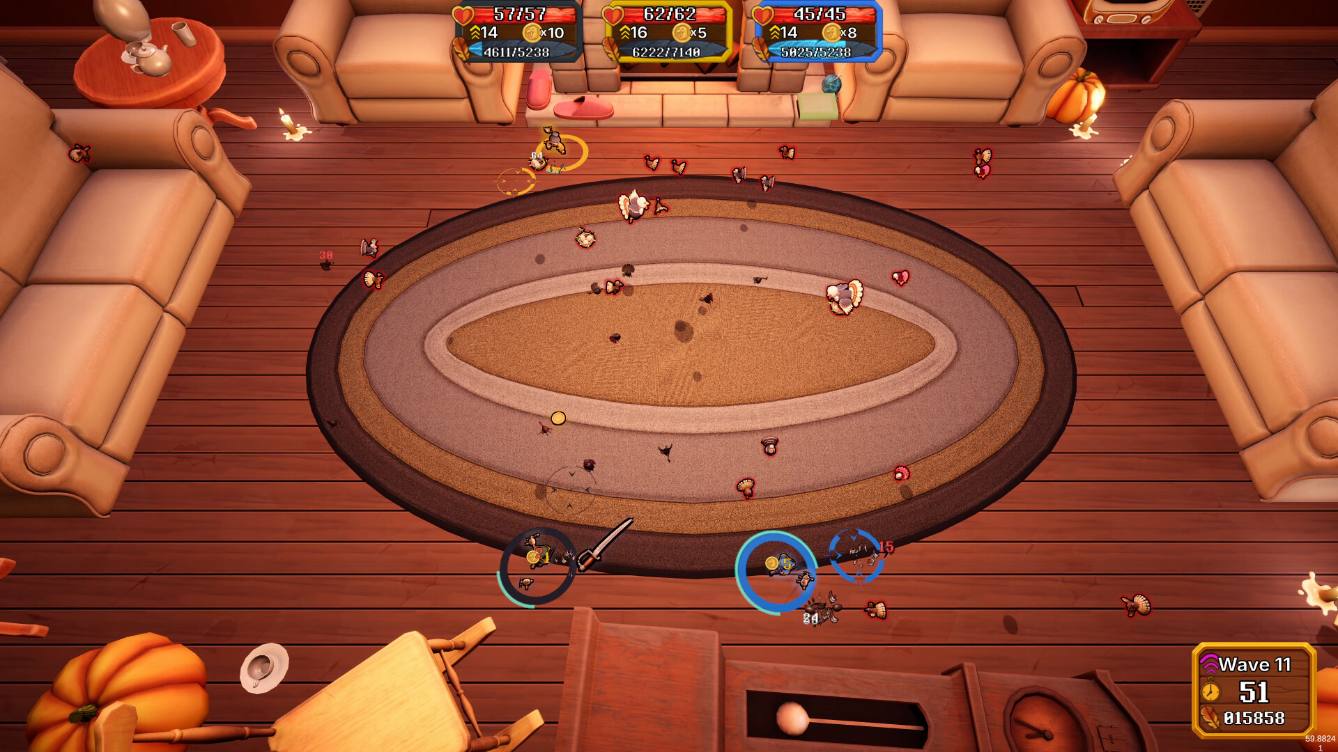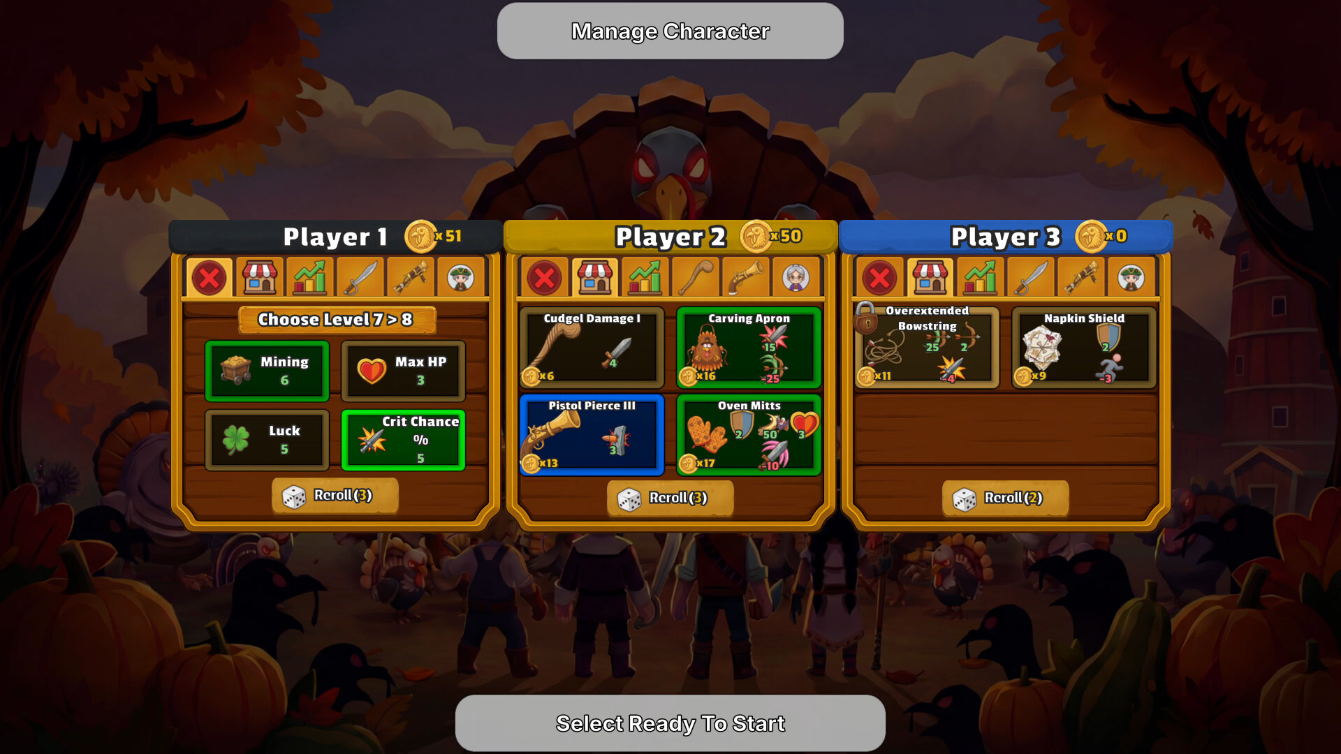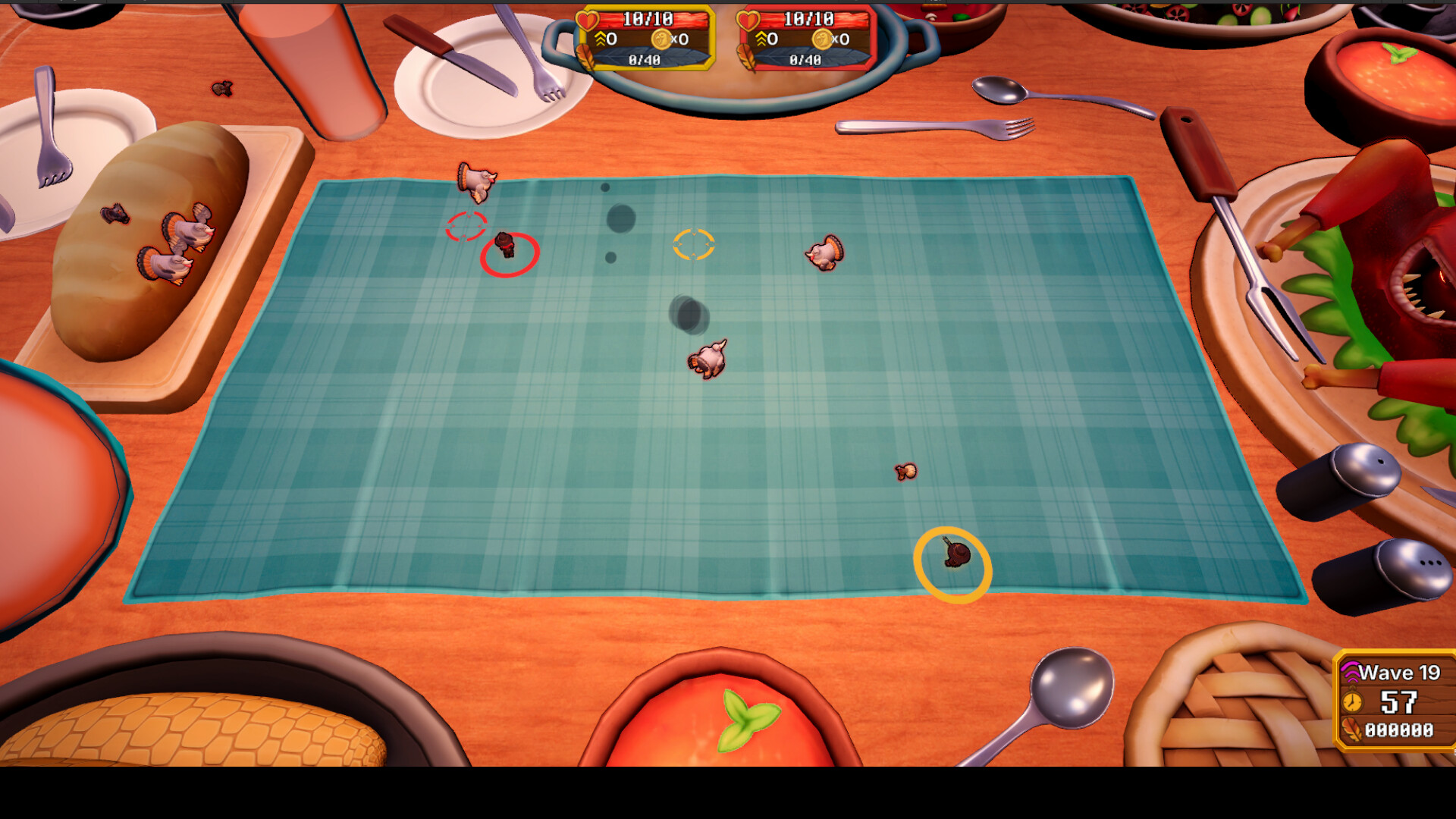 A couch co-op, bullet-heaven, twin-stick shooter for 1–8 players—blast turkey swarms, fight bosses, dodge arena hazards, and build ridiculous loadouts by leveling up and purchasing items in the shop.