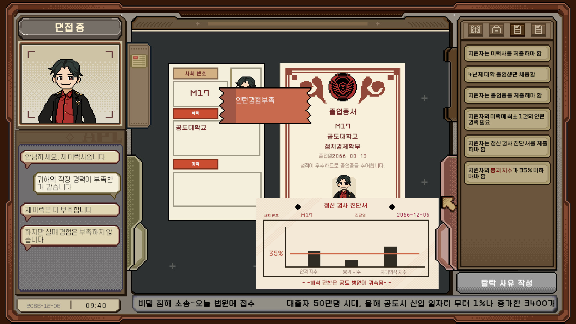 - 정신 감정서를 확인하세요. 우리 회사는 정서가 안정적인 사원을 원합니다.