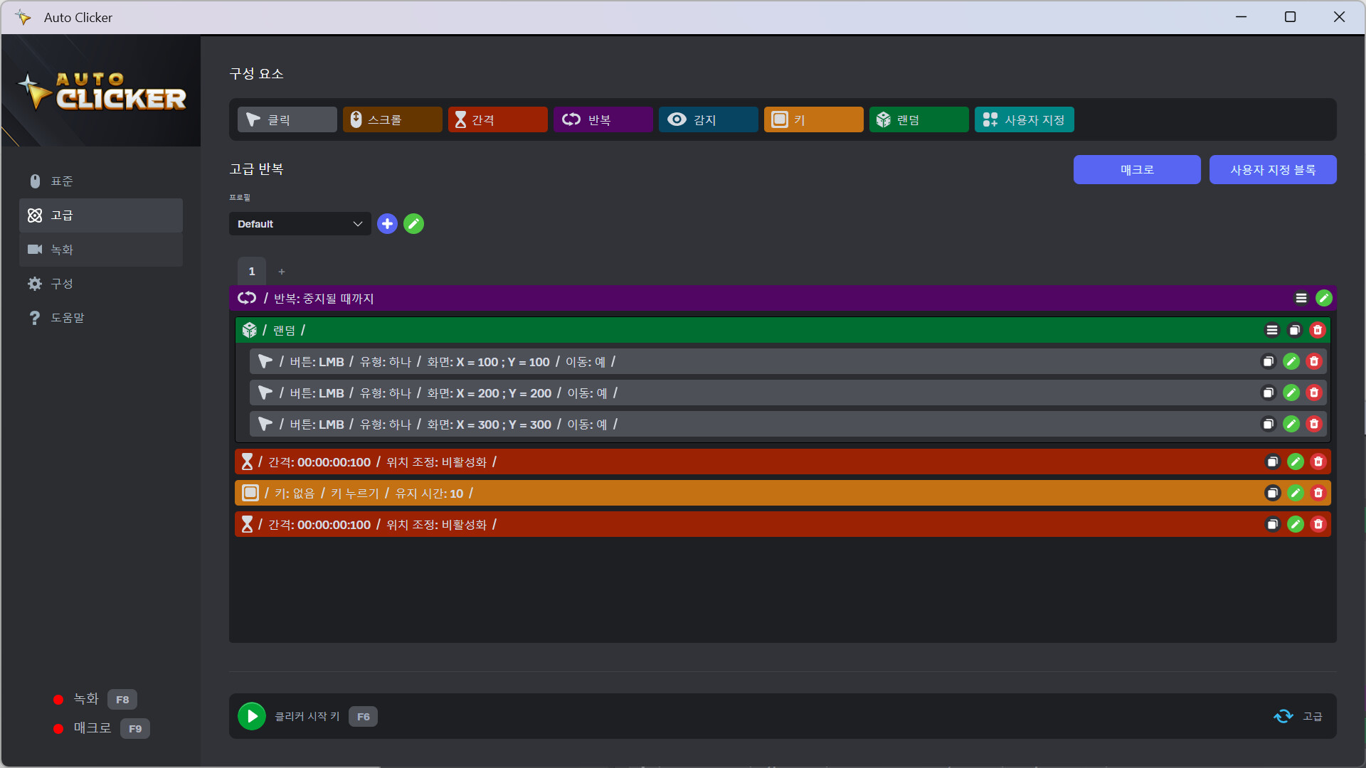 모든 클릭, 키 입력, 지연 시간을 기록하고, 이를 재생하거나 고급 작업 루틴에 가져오기 할 수 있습니다.