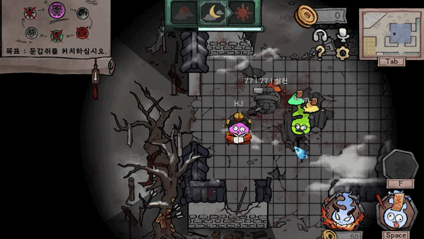 공포스러운 배경과 멍청하고 귀여운 캐릭터