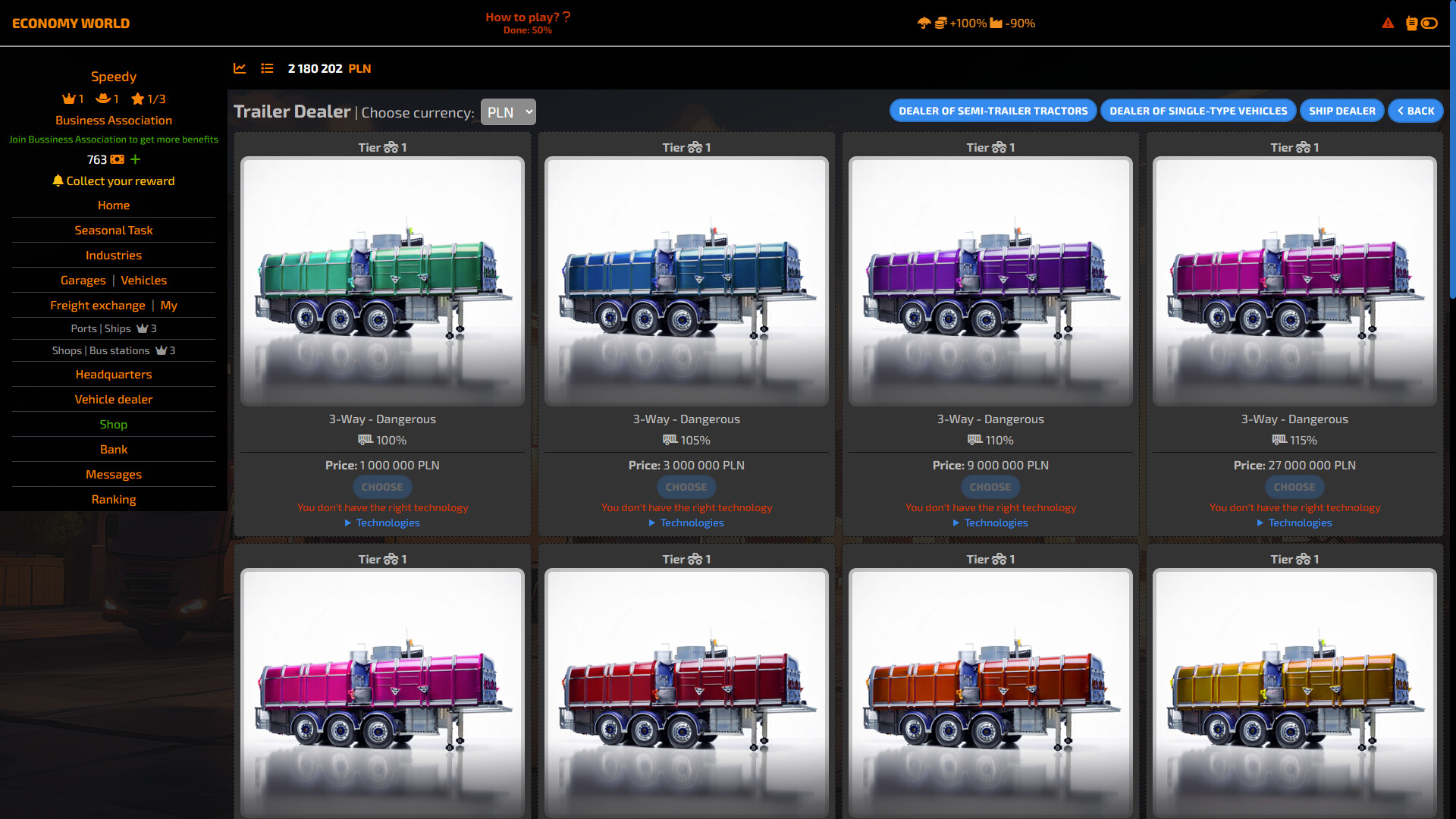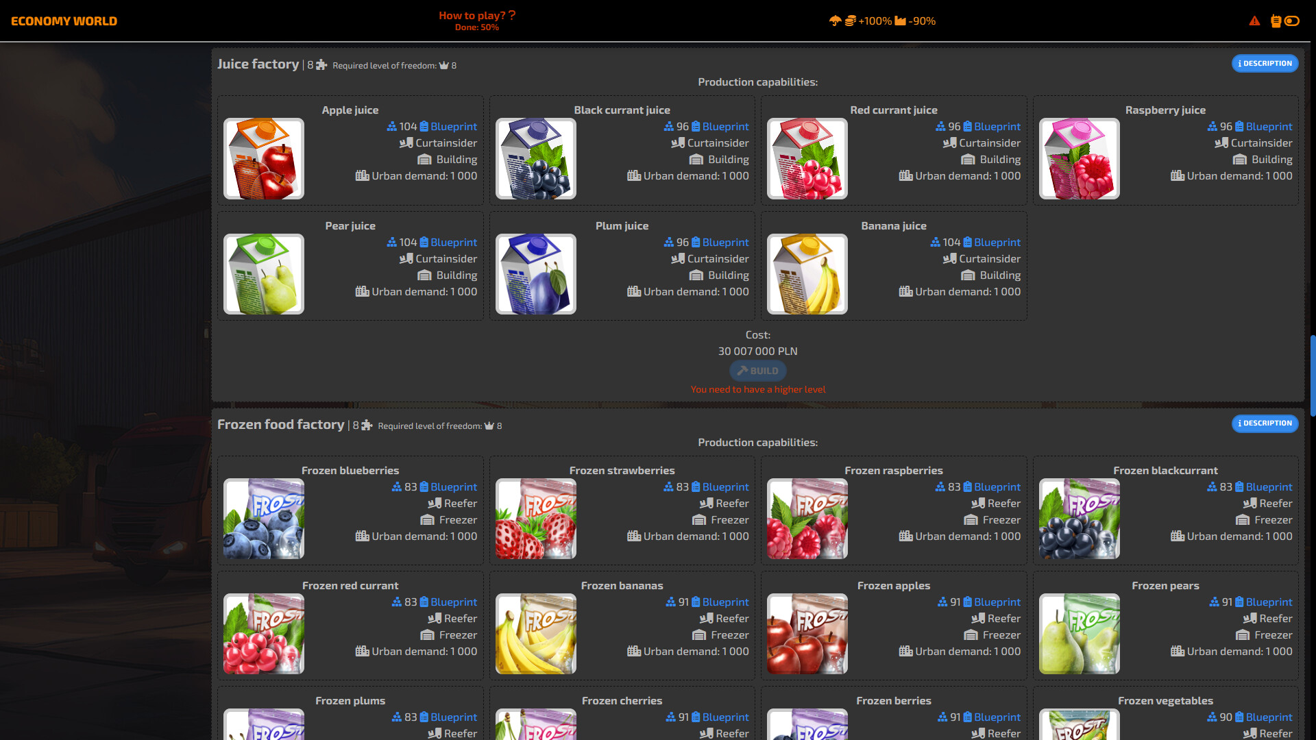Economy world is a real-time strategy where, together with other players, you try to gain the widest possible market share for your products. You start with simple grain production or mining resources in a mine and try to reach the top, which are bakeries, car or computer factories. It is up to you what direction your company will go. The game has a natural supply and demand game, so other players have an impact on the profits we earn. The raw materials we need can be on different continents, then we will be forced to build ports and buy ships that we will transport to our factories.