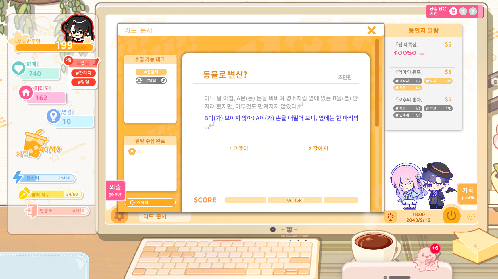■ 동인 작가가 되어 낮에는 다양한 영감을 찾기 위해 돌아다니고, 해가 지면 집에 돌아와 그 영감으로 스토리를 완성하세요.