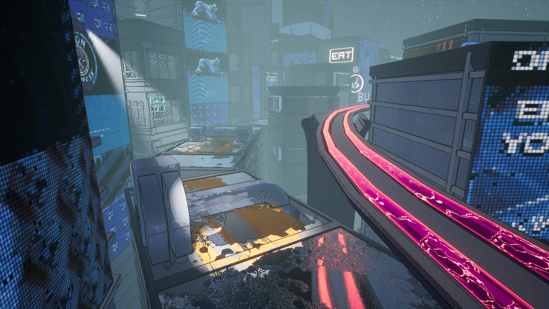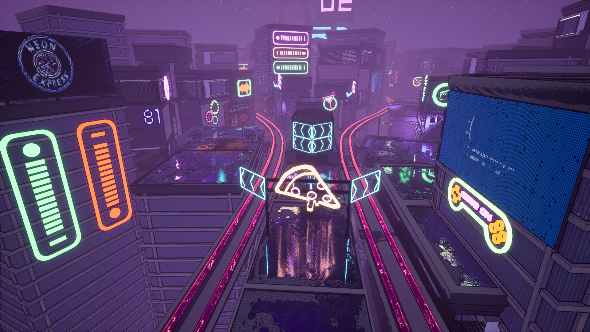 Neon Express is a 3D 3rd-person fast-paced single-player runner platformer where players take on the role of a pizza delivery girl, Velo. Gifted by electrical powers and super speed, Velo delivers pizza on foot atop the futuristic Neon City - between elevated buildings and along the intertwined bridges at which the high-speed trains run. Velo must deliver the pizza as fast as she can before the customers get impatient!