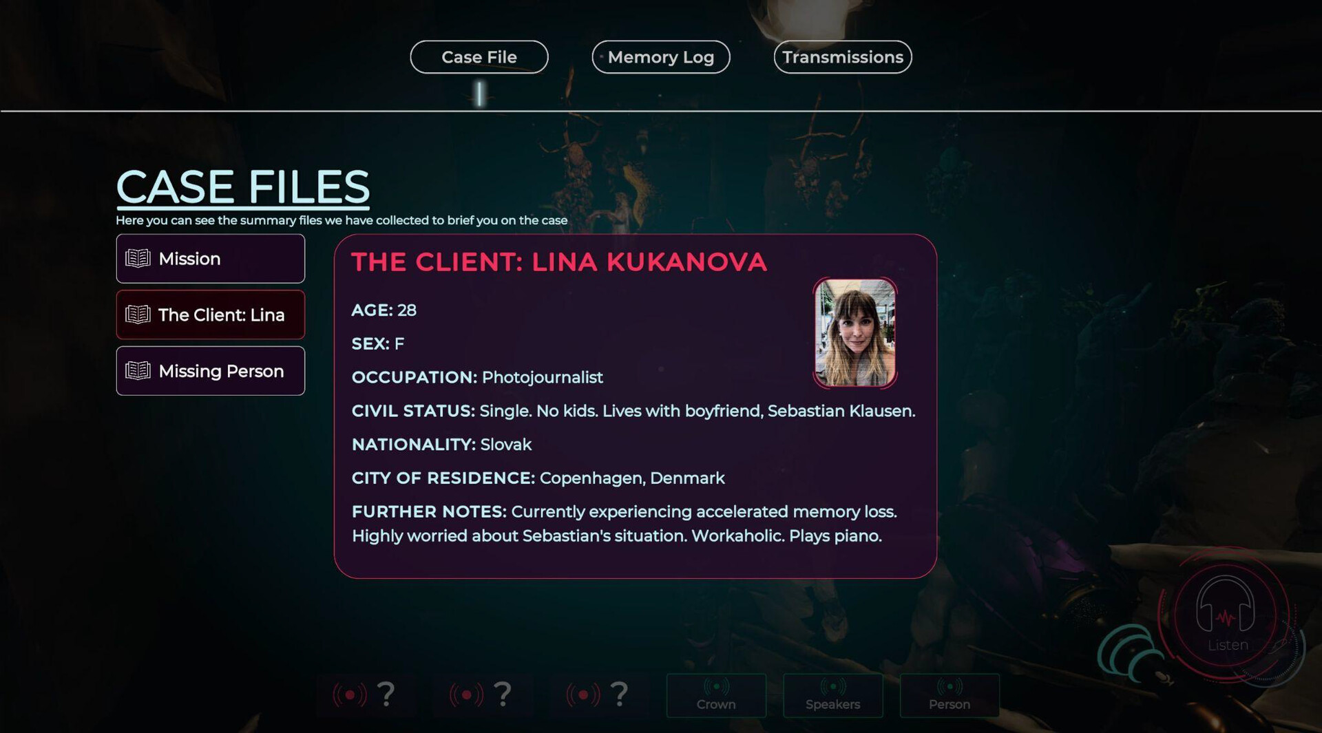 실험적인 기술로 리나의 의식의 바다에 잠수해, 조각난 기억을 복원하고 전례 없는 실종 사건의 진실을 쫓아야 하죠. 리나의 무의식 속에는 어두운 사건의 핵심 단서가 숨겨져 있습니다.