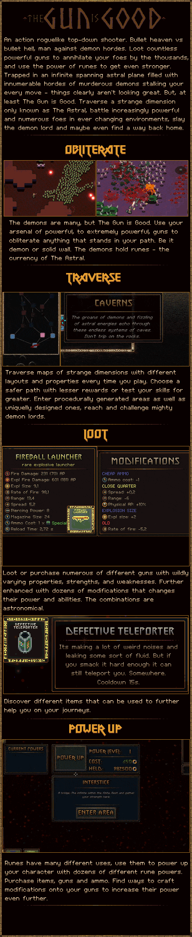 The demons are many, but The Gun is Good. Use your arsenal of powerful (to extremely powerful) guns to obliterate anything that stands in your path. Be it demon or solid wall. The demons hold runes - the currency of the astral.