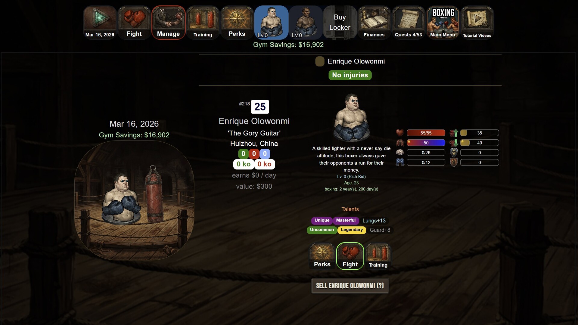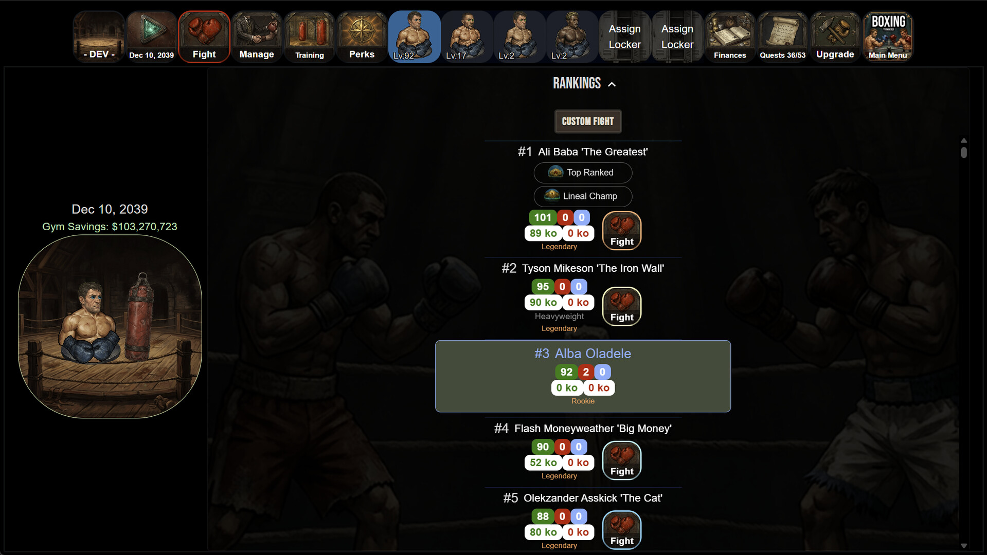 끈기, 전략, 그리고 약간의 행운이 더해지면, 당신은 체육관을 위대함으로 이끌고 역대 최고의 복싱 매니저 중 한 명으로서의 전설을 굳힐 수 있습니다. Discord에 참여해 파이터를 공유하고 토너먼트에 도전하세요.
