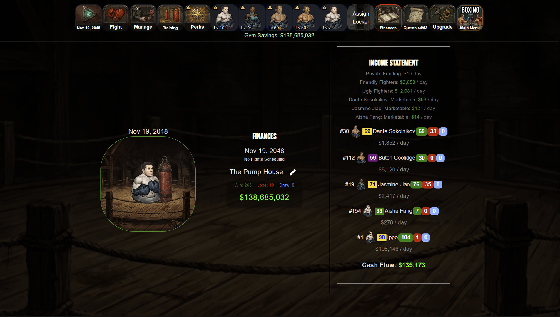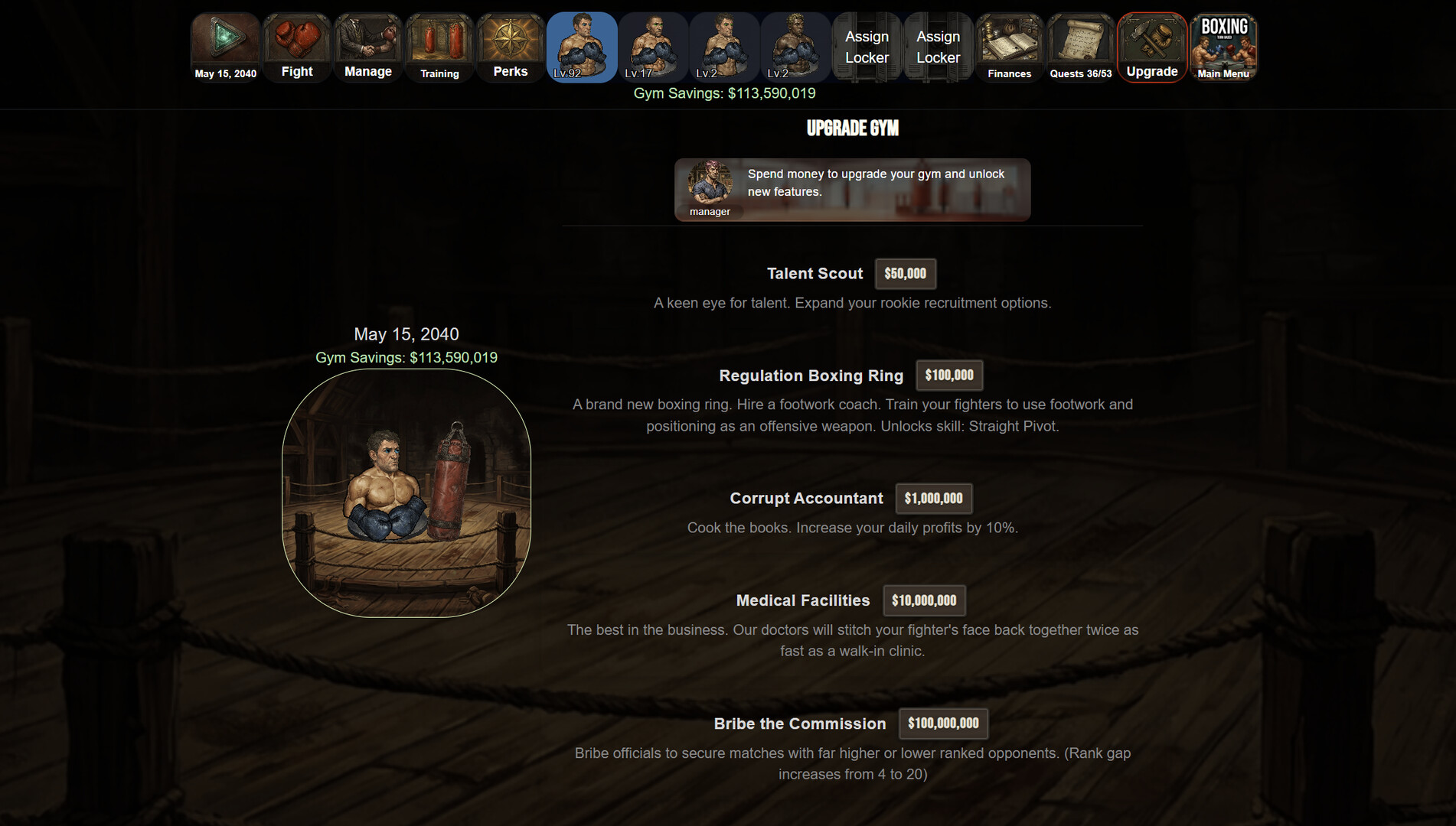 현금을 배정해 복서의 기본 스탯을 올리세요. 각 스탯은 링에서의 전체 성과에 기여하며, 향상시킬 수 있습니다. 일부 스탯에는 별이 표시되는데, 이는 그 복서가 재능이 있다는 뜻입니다.