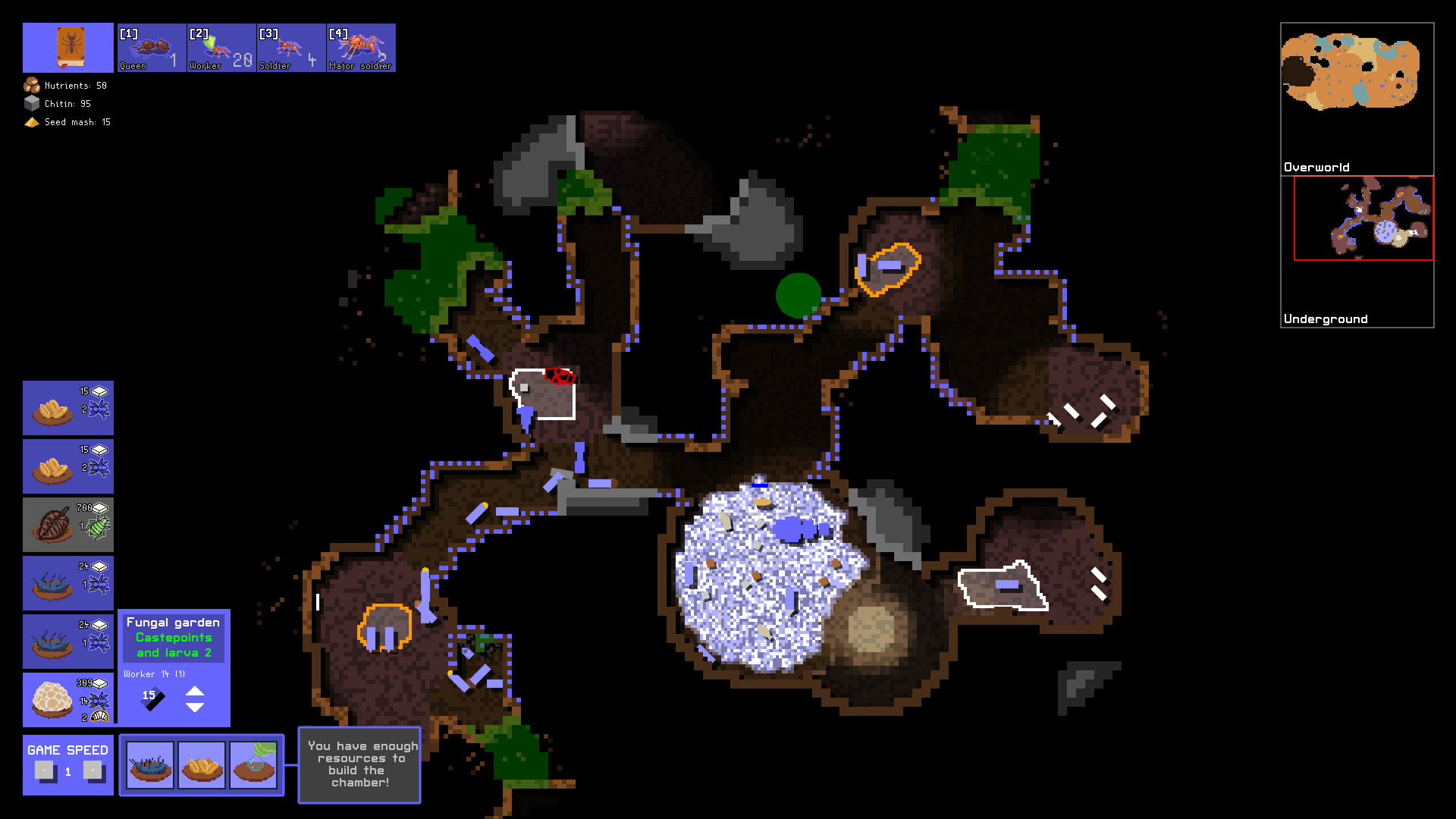 Exploration and Expansion: Explore the surrounding world by digging new tunnels underground or sending agile scouts to the surface. The colony must face rival ant species, predatory insects (such as antlions or spiders), and expand its influence until it becomes the dominant force within the ecosystem.