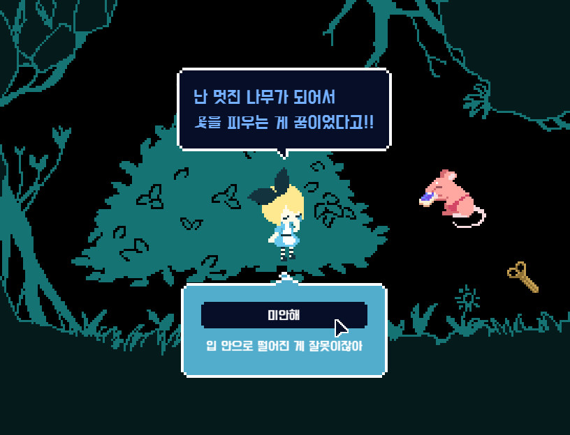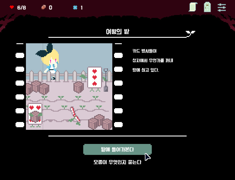 하나의 맵 안에서 플레이어는 어느 길로 갈지 선택하고, 무작위로 발생하는 이야기를 읽으며 앨리스의 행동을 결정하는 간단한 게임입니다.