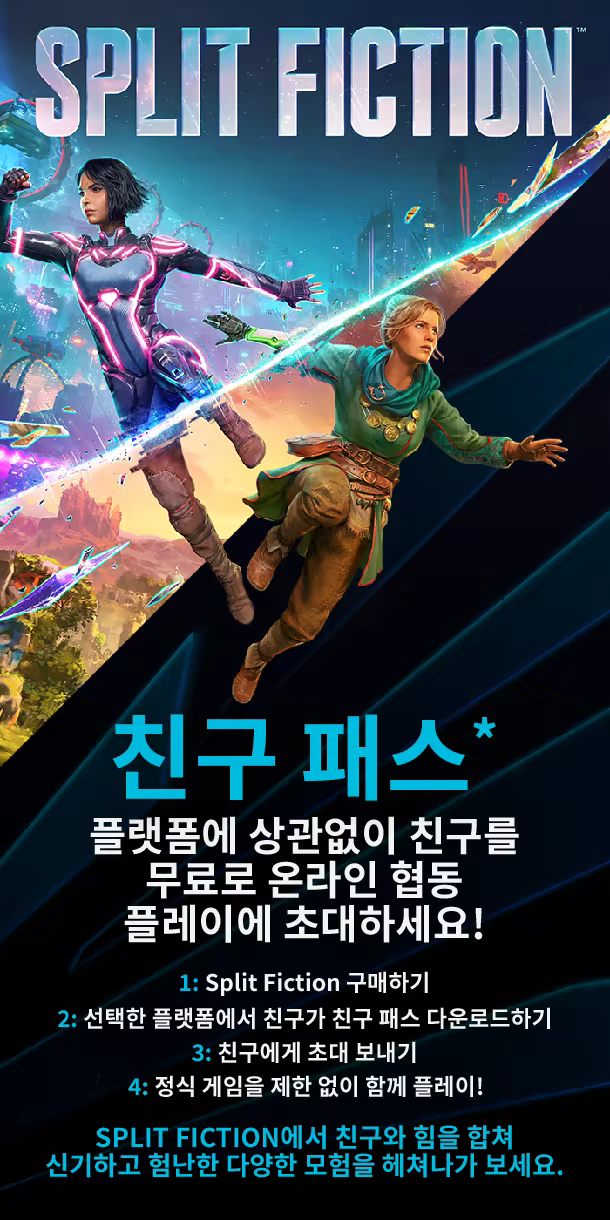 친구 패스*를 다운로드하고 어떤 플랫폼에서나 친구와 Split Fiction을 무료로 플레이하세요! 친구 패스 소유자와 함께 카우치 협동 또는 온라인 크로스 플랫폼으로 게임의 초기 단계를 체험하세요. 친구가 정식 게임을 소유하고 있다면, 무료로 모든 모험을 함께 할 수 있습니다.