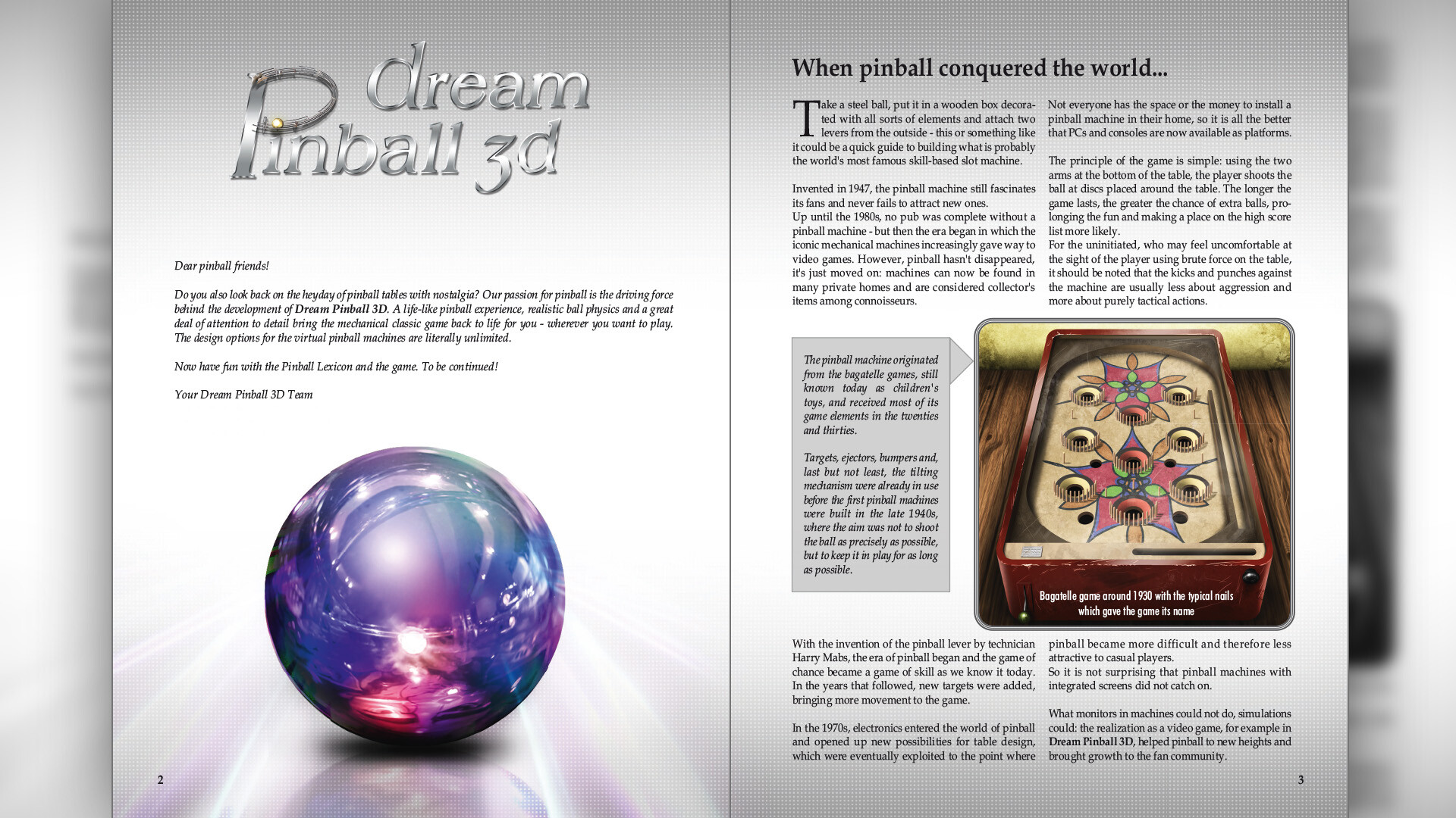 This exclusive add-on includes an extensive Pinball Magazine (PDF) featuring a complete pinball lexicon from A to Z, fascinating background information on the history and creation of pinball machines, as well as tips and tricks from professional players.