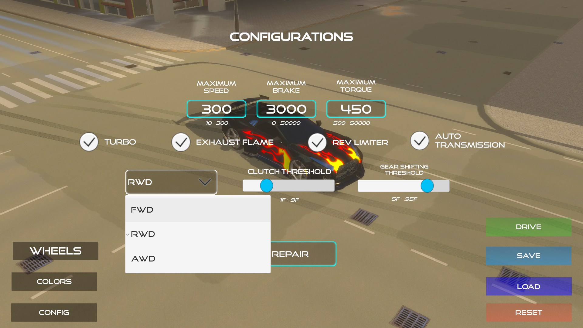 Maximum Speed Maximum Brake Maximum Torque, Turbo, Exhaust Flame, Rev Limiter, Auto Transmission RWD FWD ADW, Clutch Threshold, Gear Shifting Threshold.