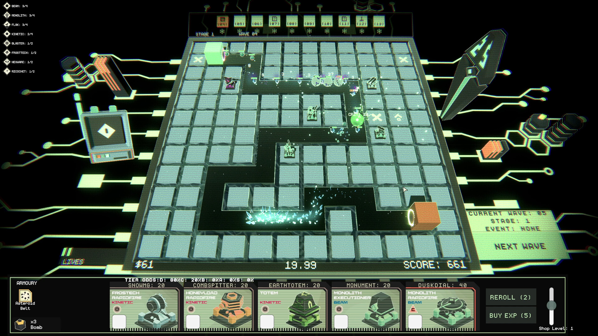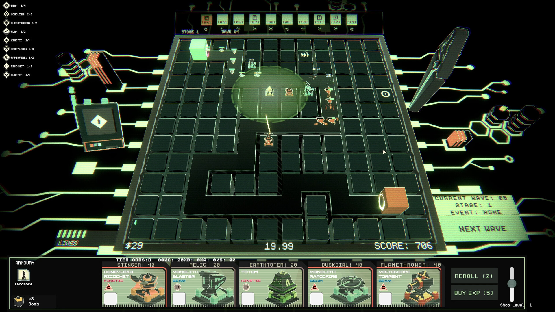 Survive Ninety Nine waves. Build a board of towers from different manufacturers with varied abilities, equip them with Mods and Buddies and plan ahead to deal with enemy-buffing weather forecasts.