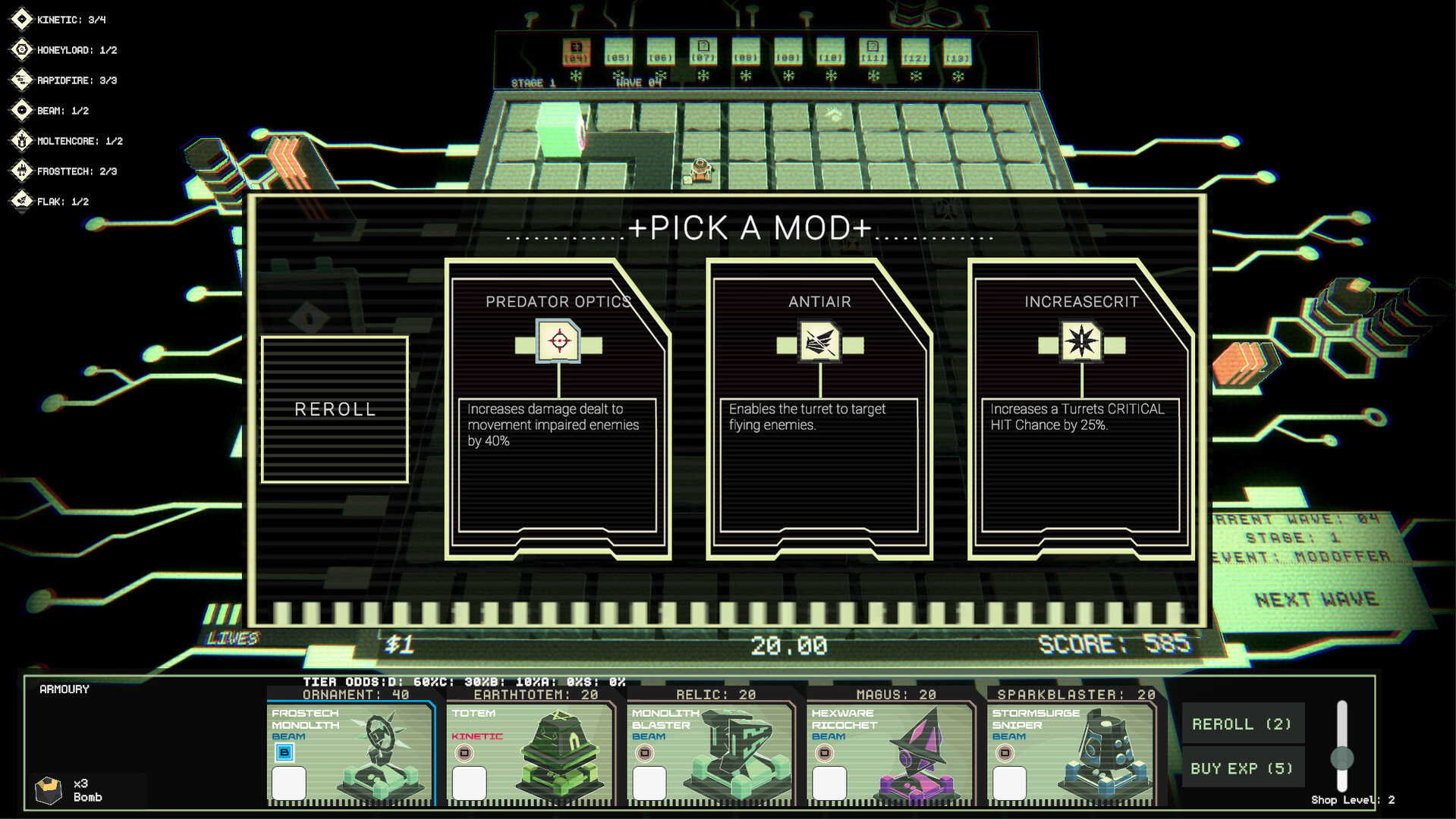 Collect bits to build towers, adapt to your randomized shop in search of those important upgrades and strengthen your towers with Mods and Buddies to create powerful combinations.