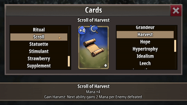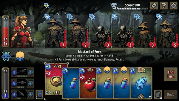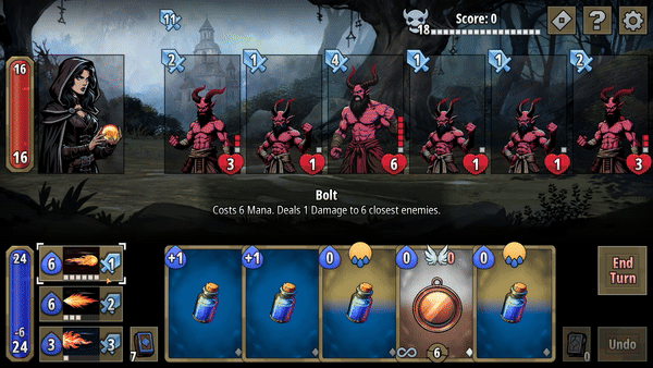 영웅은 마나를 소모하는 3가지 능력을 가지고 있습니다. 카드는 마나를 생성하거나, 능력을 강화하거나, 영웅을 치유합니다.범위 기반 전투: