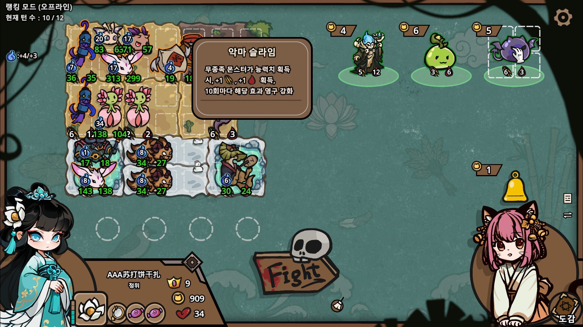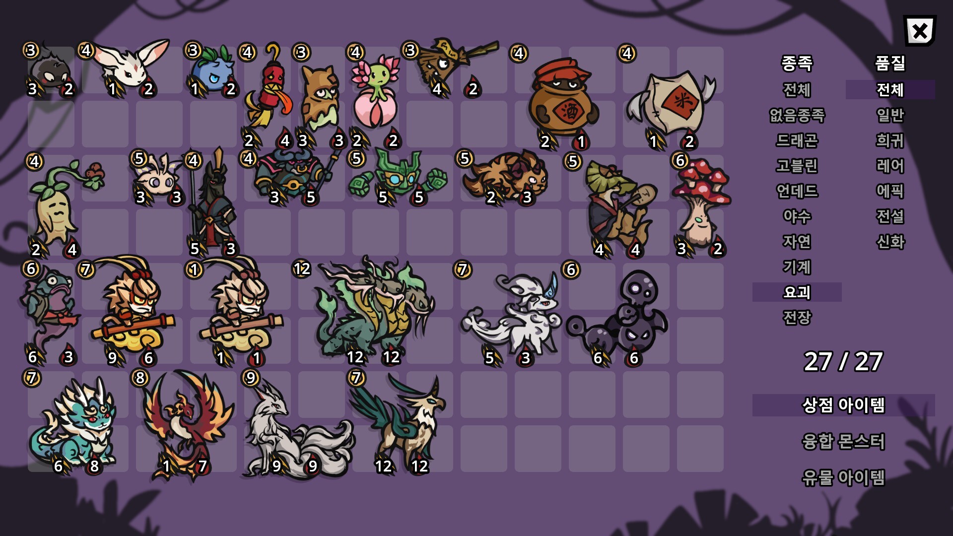 백팩류에 오토체스 더해 놓은 겜임 ㅇㅇ 몹들 종류랑 스킬 배치에따라 시너지 나는건 전형적인 백팩류고 상당히 재미있는 결과가 나올 떄도 있음 몹들이 공격수이자 몸빵인 것이 특징임00 자기가 죽는 걸로 트리거 하는 능력이 있기도 하고 반대로 몹이 죽으면 발동이 안되는 스킬도 있음 존나 썐놈도 채력이 낮거나 운 없음 얼마 못 떄리고 죽기도 하고 다른 백팩류랑 달리 가방안에 몹이 죽으니까 생기는 변수가 특징적이내 일본겜인거 같은데? 그 와중에 호박머리 캐릭은 한국어 하더라 ㅋㅋㅋㅋ 나름 종족별로 시너지나 태마가 확실하고 2종족에 걸쳐서 동시에 보너스 주는 애도 있음 근데 보통 단일댁 짜는게 더 간편하더라 캐릭터 별로 가진 고유스킬이 막 결정적인 차이는 아닌데 소소하게 차이가 나긴 남