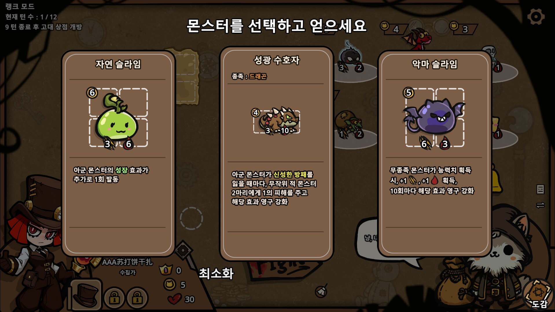 하스스톤 전장에 백팩히어로를 섞은 느낌. 근데 아직 영웅별 밸런스는 필요해 보임. 여행상인이 4코인마다 능력강화가 아니라 3코인마다 능력강화로 바껴야 할 듯 초반 체급이 너무 약함 호박머리는 왜 2*2 상자 주면서 시작 땅이 2*2인지 모르겠음 3*2 주는 애들도 있고 죽메 고양이는 4*2로 시작하는데 호박머리도 3*2로 시작해야 된다고 생각함