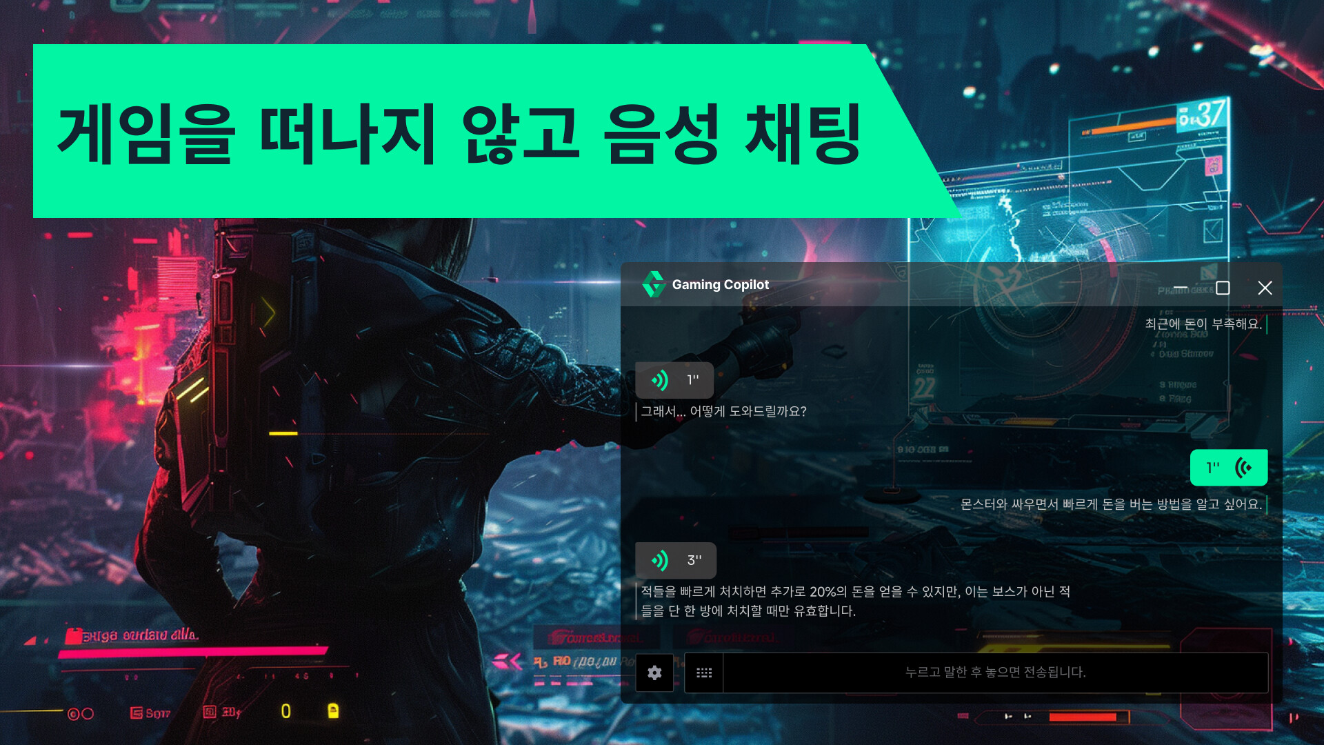 솔로 게이머: 실시간 음성 상호작용으로 대화하며 게임 어시스턴트이자 변함없는 동반자 역할을 하여 즐거움을 더합니다.