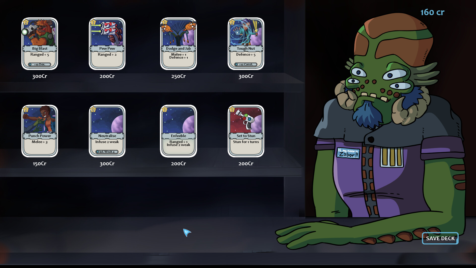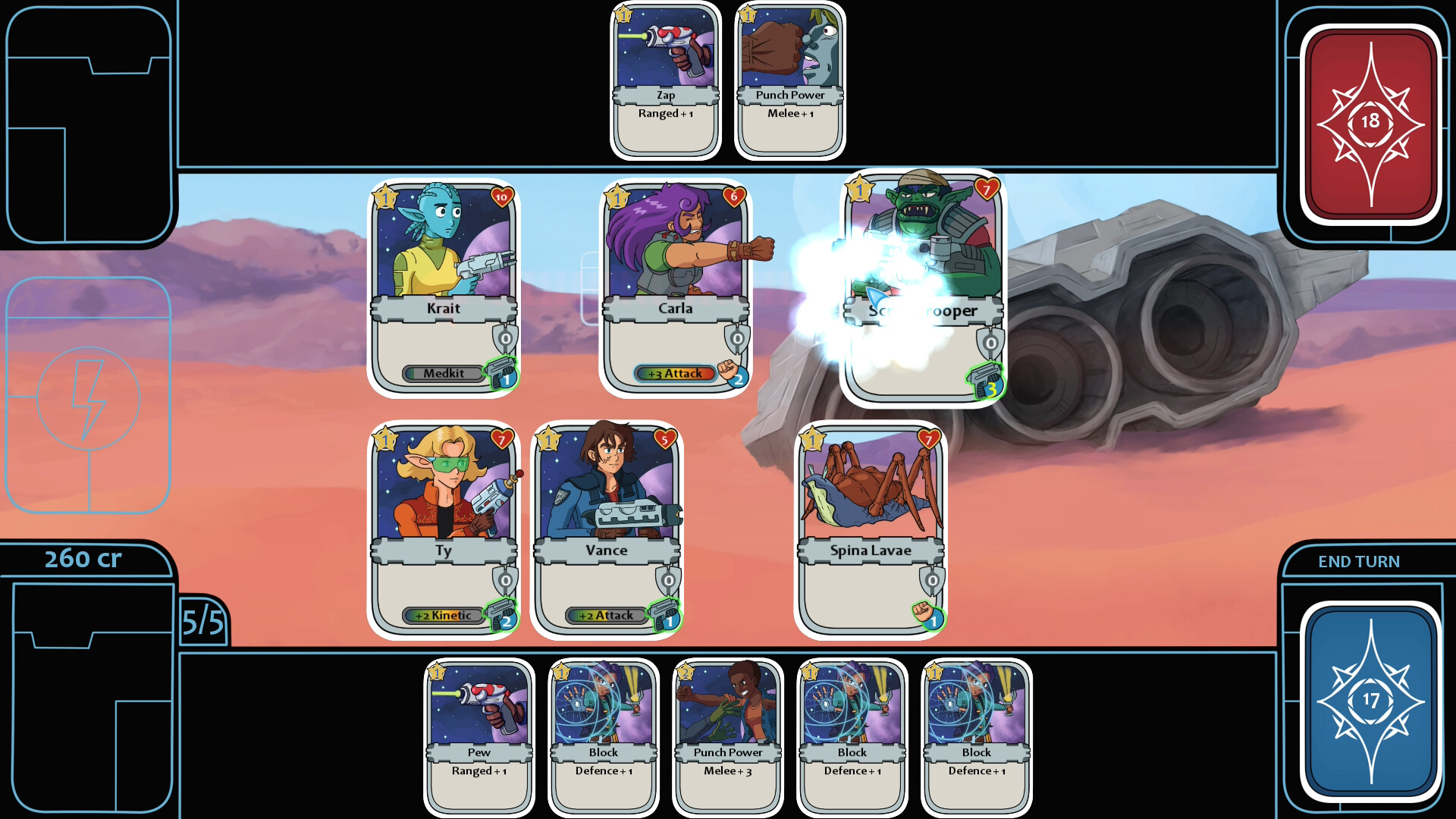 - Build your collection of cards by choosing from a selection after each battle. Or spend your hard earned credits to buy new cards from shops you'll encounter while down on the planet surface.