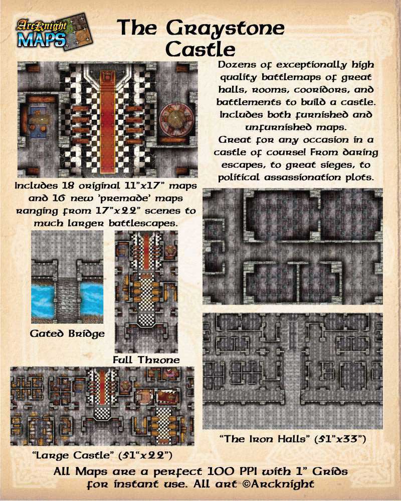 Dozens of high quality battlemaps of great halls, rooms, corridors, and battlements to build a castle. Includes both furnished and unfurnished maps.