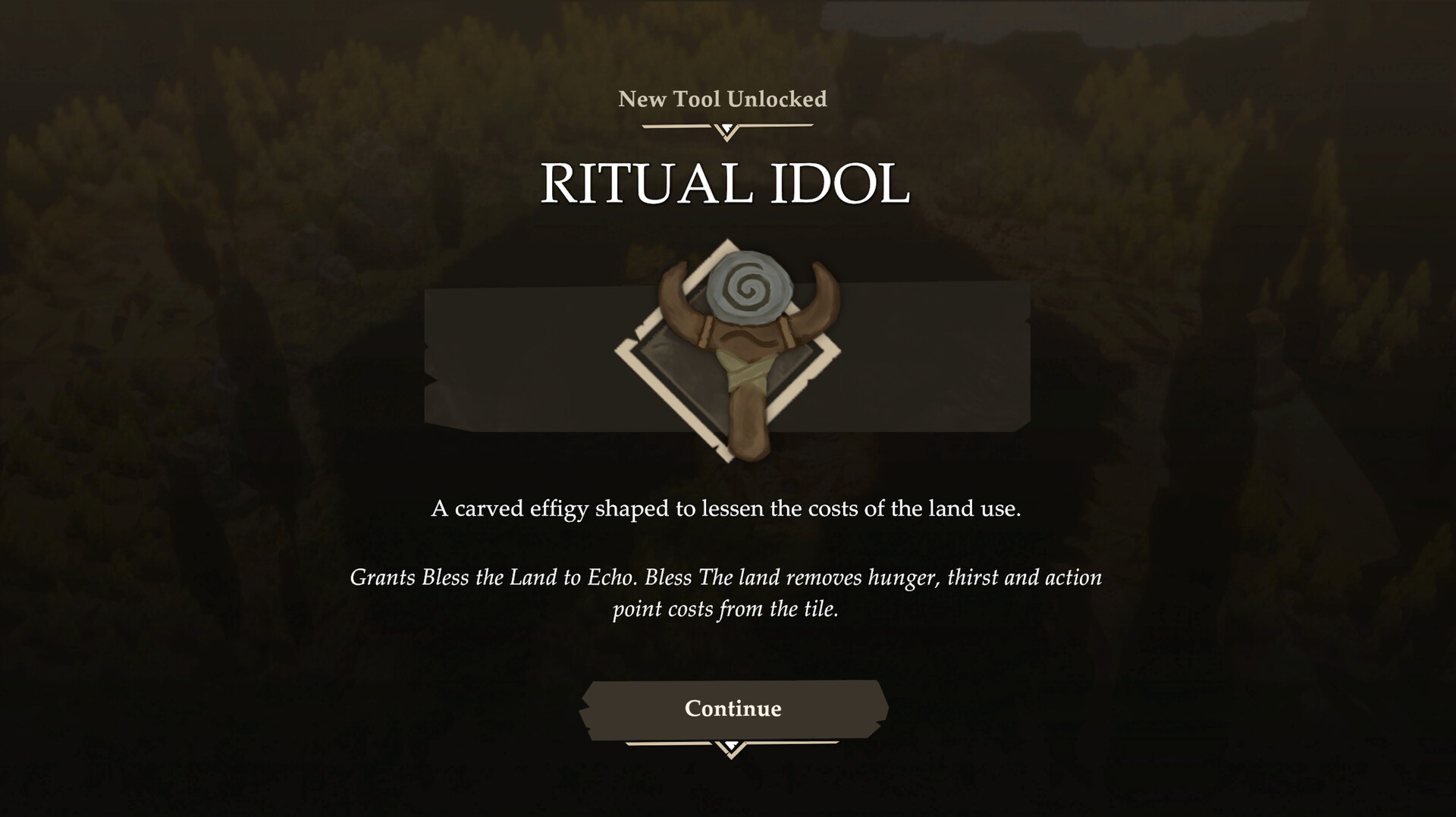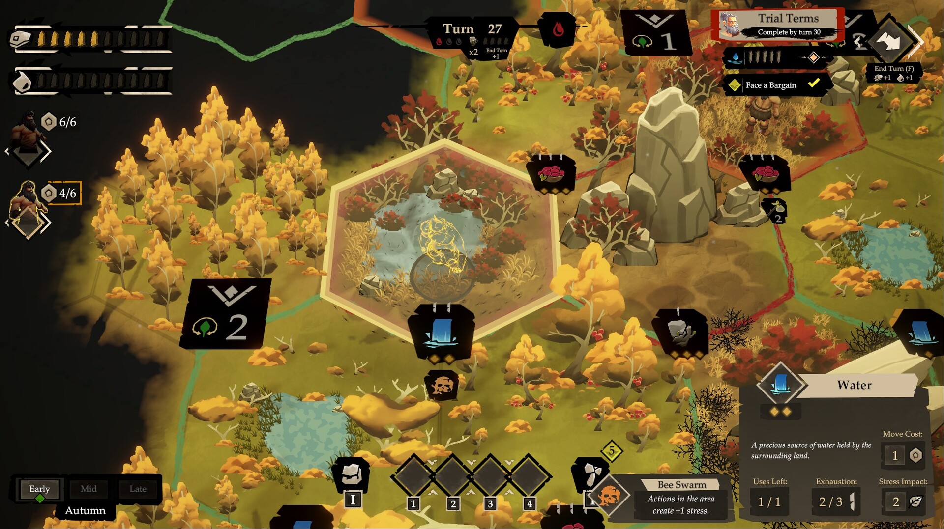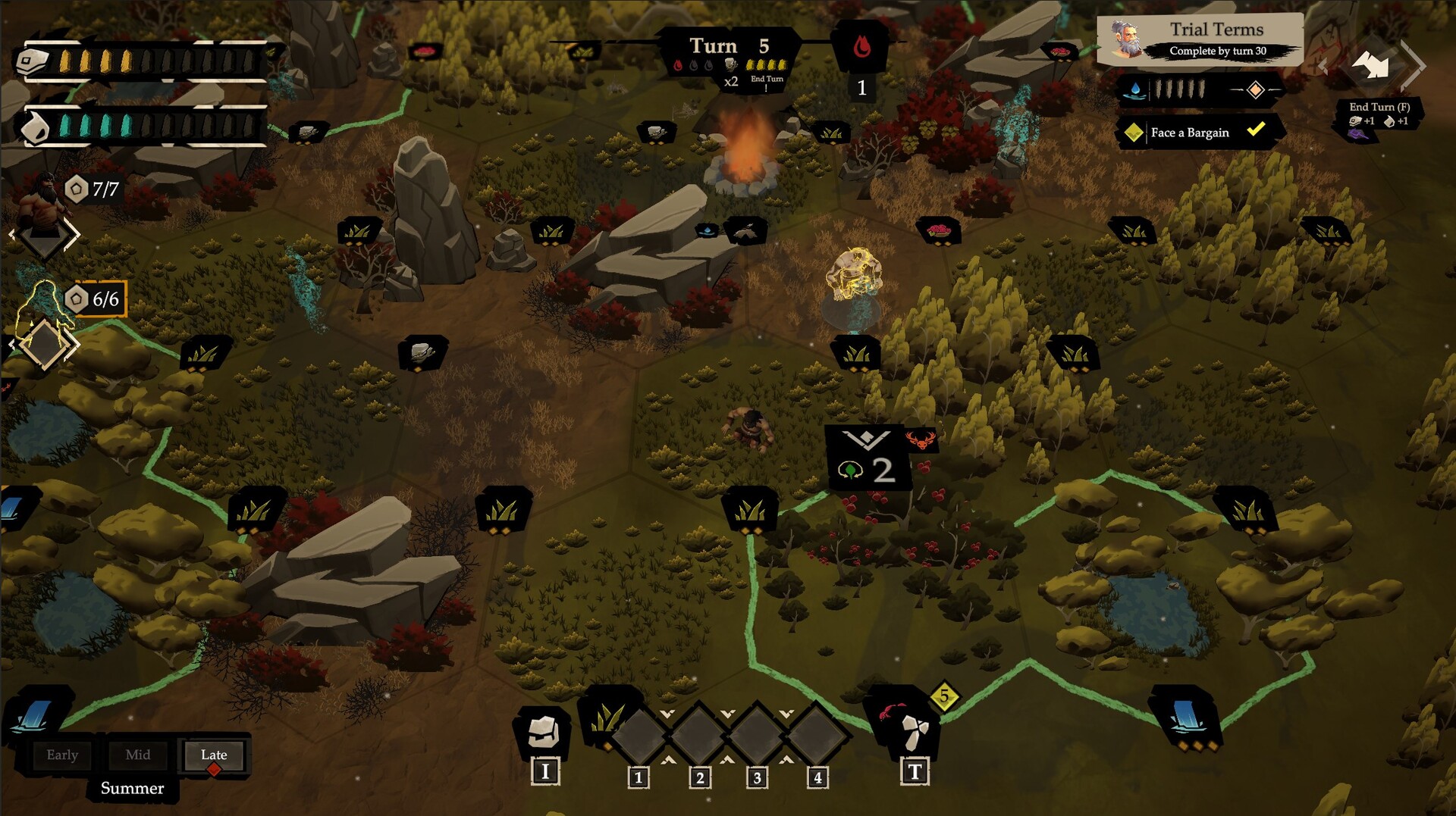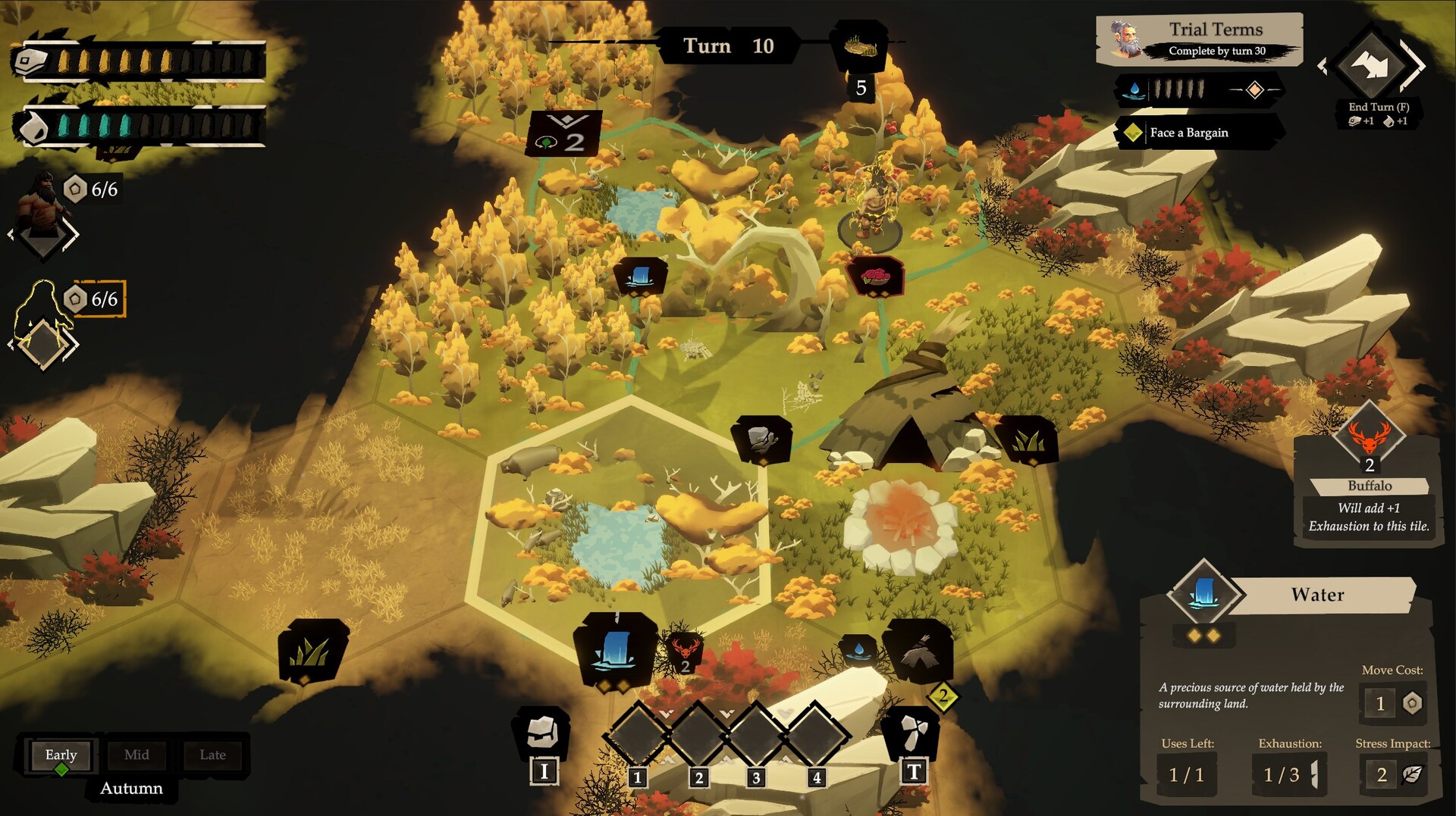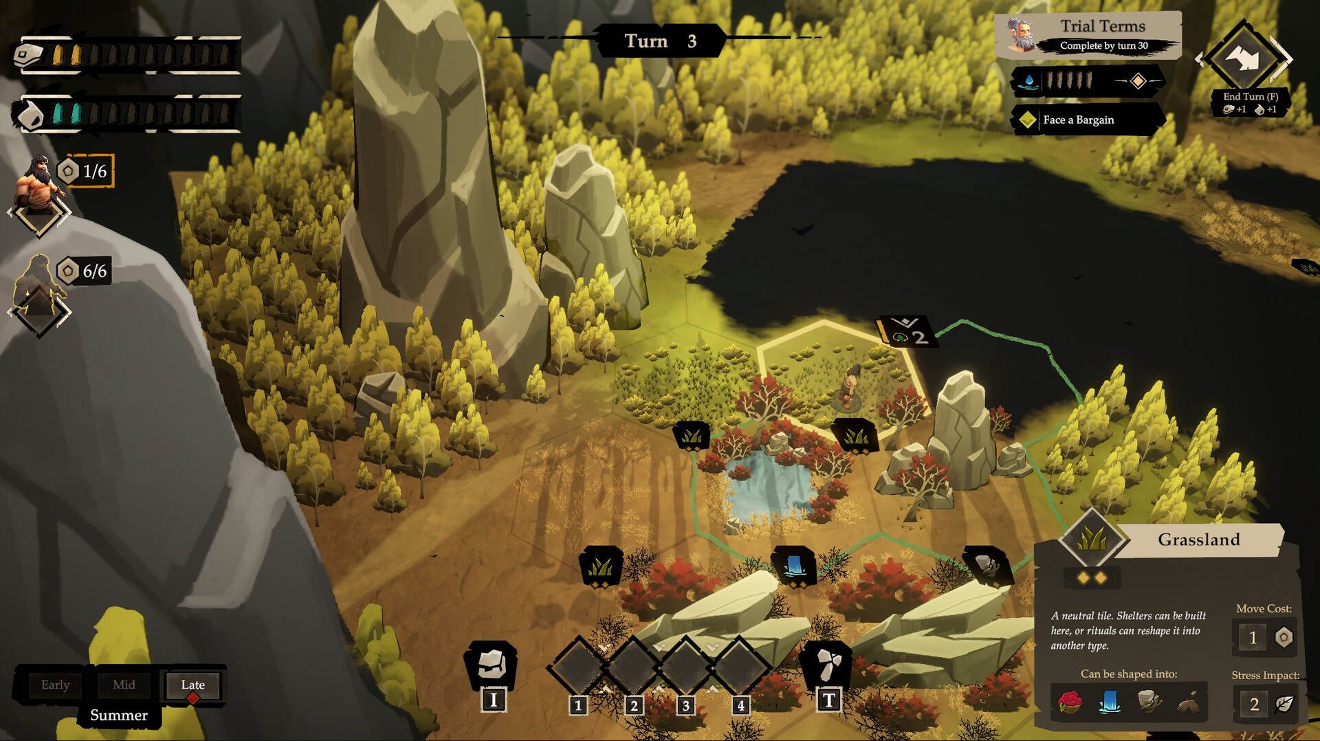Gather With Purpose: Food, water, and materials are never guaranteed. Tiles deplete and can return in new forms. Over time you learn how each area of land tends to cycle. Push too hard and tiles slip into barren grassland, weakening yields and stressing their local area. Restore worn ground to keep the cycle flowing. Seasons change what is available and when, so your gather plan shifts from summer abundance to autumn scarcity. Many actions offer a real tradeoff: take more now and strain the land, take less to keep the area steady, or invest extra effort to improve what the tile becomes next.