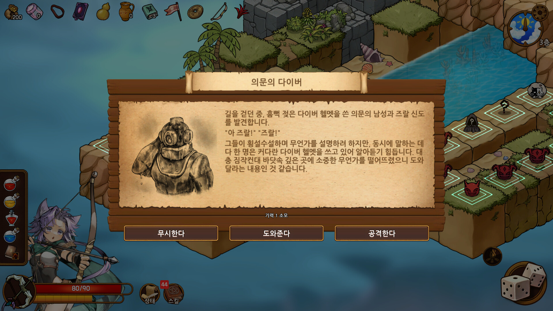 모바일 버전의 스팀 이식판 스팀 이식한다고 패치도 기대했지만 생각보다 바쁜 모양인지 모바일 버전과 내용적인 다른 점은 없음 다른건 가격부분하고 상점, 발굴이나 랭킹 부분 확인하는 창을 찾아보기 어렵다는 정도? 가장 많이 보는 부분임에도 불구하고 찾으려면 특정 페이지로 넘어가야 한다는게 아쉬움 PC에서의 사용을 전제로 했지만 급하게 이식한 탓에 최적화, 화면크기 조정 불가 등의 이슈가 있으며 키 조작 부분에서는 유저 측면을 고려가 안된거 같은 미흡함이 보임 현재 스킬 대상 선택에는 1,2,3 키를 누르고 적용은 E키 턴 넘김은 SPACE키인데 만들다 만것 같은 허전함이 느껴지는 부분 이벤트 선택지에 1,2,3 키를 넣을 법도 한데 확인 부분만 E키가 넣어져 있고 스킬 갯수가 점점 늘어나는 형식이기에 선택부분에는 스킬 1 << (A) [ 스킬2 ] (D) >> 스킬 3 이런식으로 스킬 좌우로 이동하여 선택하는 키조작 등을 넣는 방법도 있었겠지만 없어서 아쉬움 아직 미완성이기에 다른 사람에게 권장하지 않음 그래도 나름 재미는 갖추고 있어서 호기심이 동한다면 모바일 버전을 권장하거나 맛만 보라고 하고 싶음
