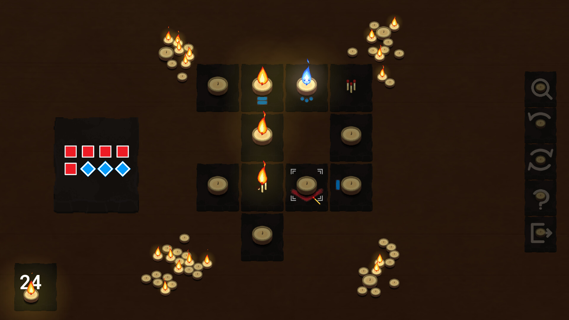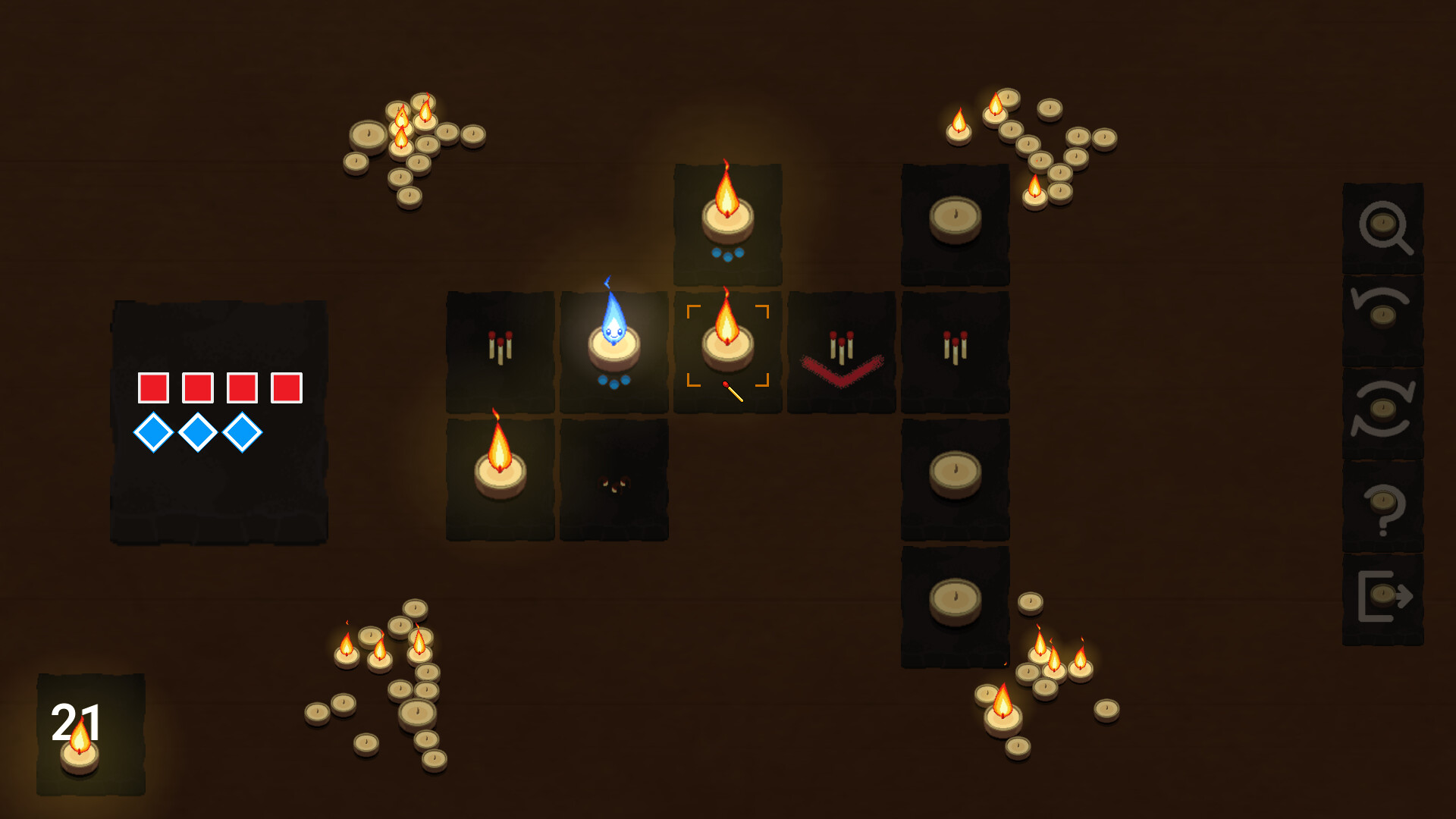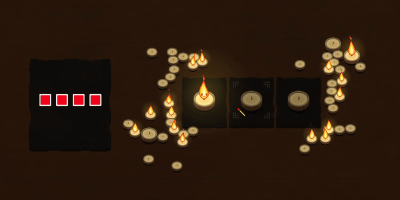 타일 기반 퍼즐 게임에서 초, 성냥, 연료 사이를 뛰어다니며 목표는 단순합니다: 불꽃이 꺼지기 전에 모든 초를 밝히세요.