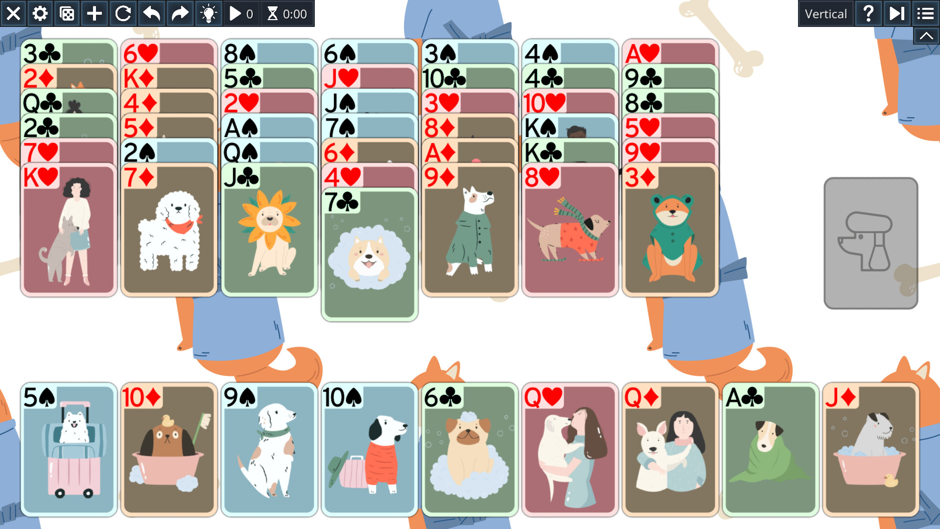무료 솔리테어용 추가 개/강아지 테마 카드 세트. 또한 뒷면, 배경, 보드 요소 및 UI 사진.